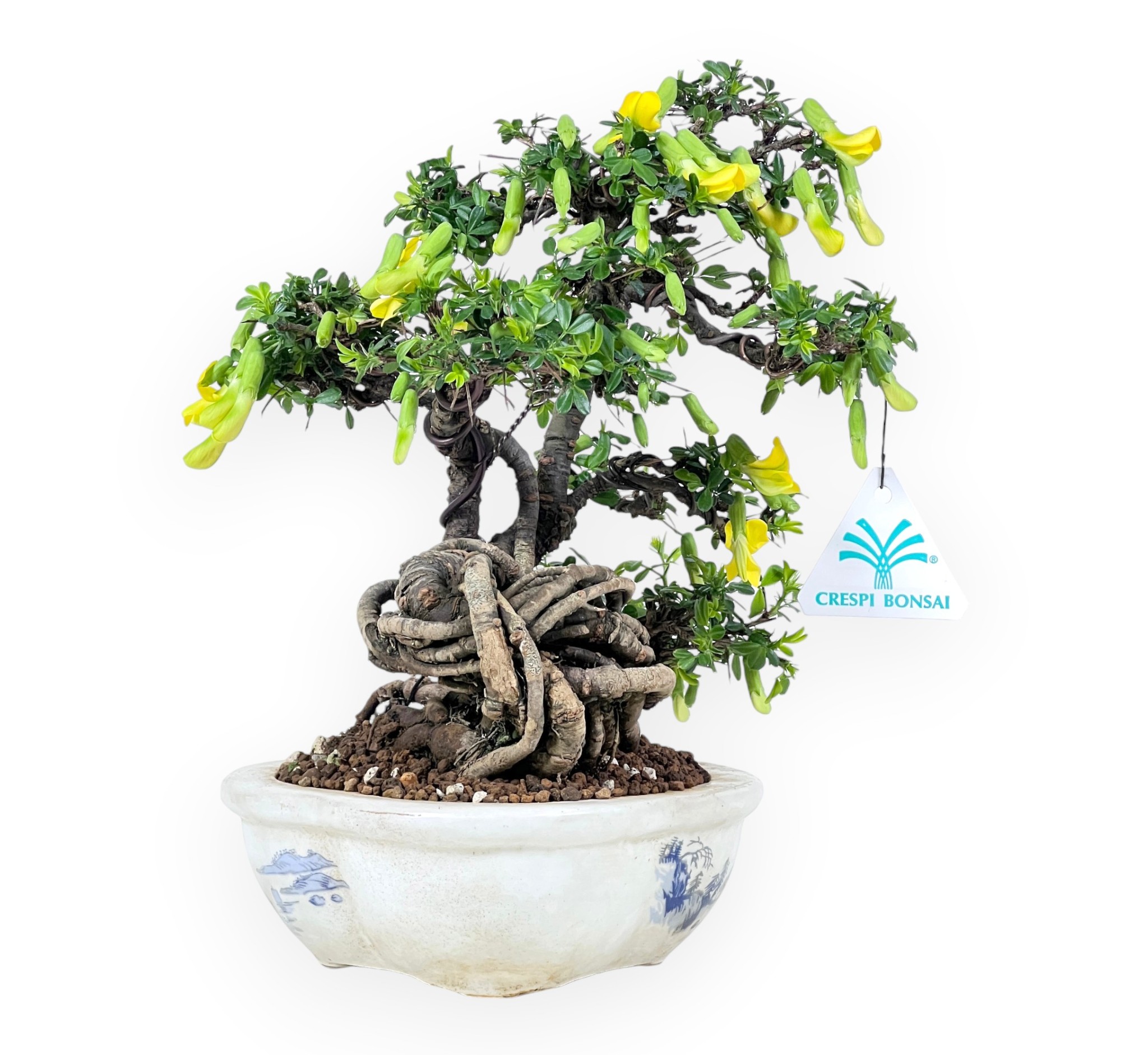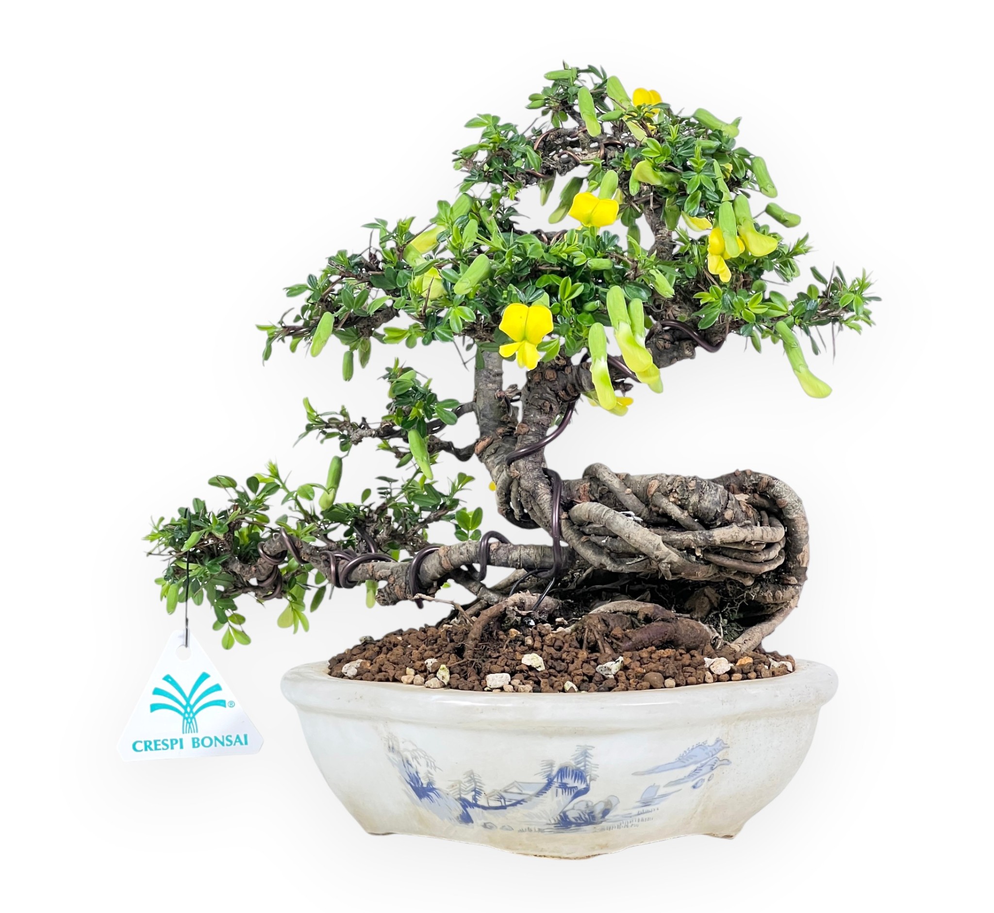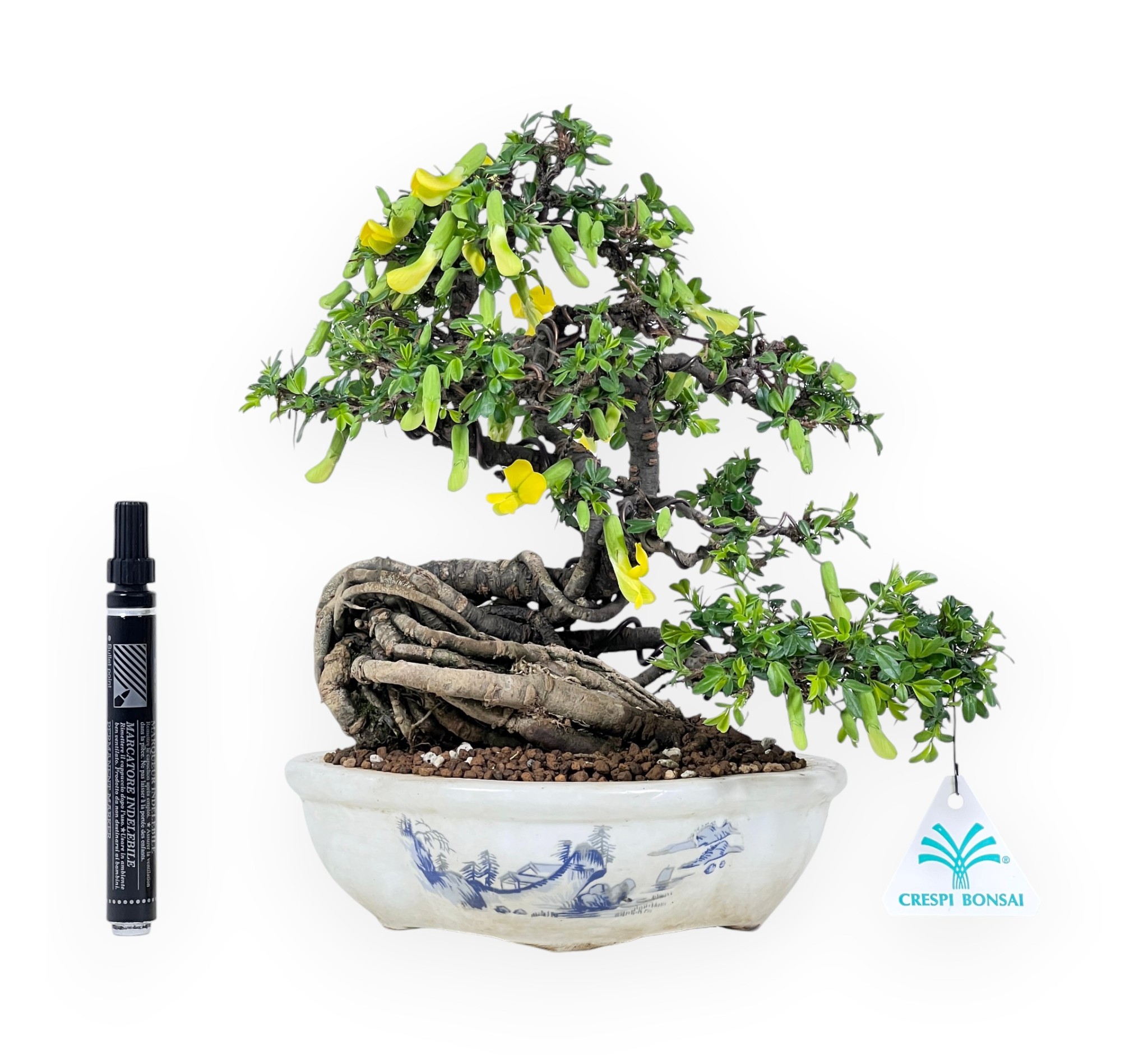 Caragana Bonsai, ein blühender Laubbaum, wird wegen seiner Robustheit und seiner zarten gelben Blüten geschätzt. Die Krone besteht aus kleinen oval Blättern, die im Frühling und Sommer leuchtend grün sind. Im Herbst färbt sich das Laub orange-gelb und fällt im Winter ab. Er hat einen sehr robusten Stamm mit freiliegenden Wurzeln, die die Kraft und Reife der Pflanze unterstreichen. Er weist einen Stil mit freiliegenden Wurzeln (Neagari) auf, eine Technik, die die Wurzeln hervorhebt, die sich auf natürliche und harmonische Weise aus dem Substrat heraus erstrecken und einen skulpturalen und dynamischen Effekt erzeugen. In einem Wolke creme glasierten Steingut Topf, dessen blau Verzierungen typische orientalische Landschaften darstellen, bringt die Farben der Blüten und Blätter besonders gut zur Geltung und bildet einen eleganten Kontrast zur Struktur des Stammes.