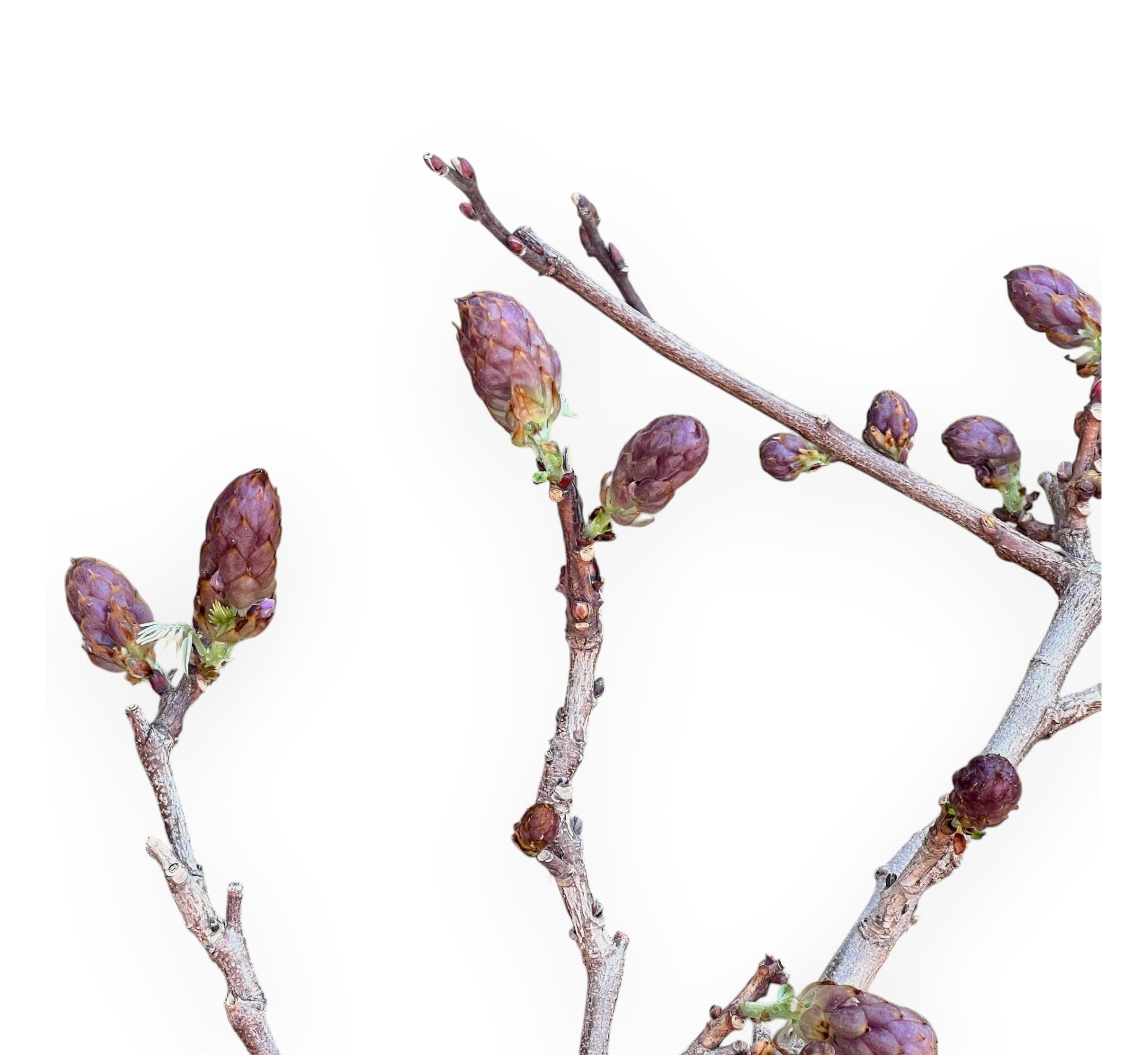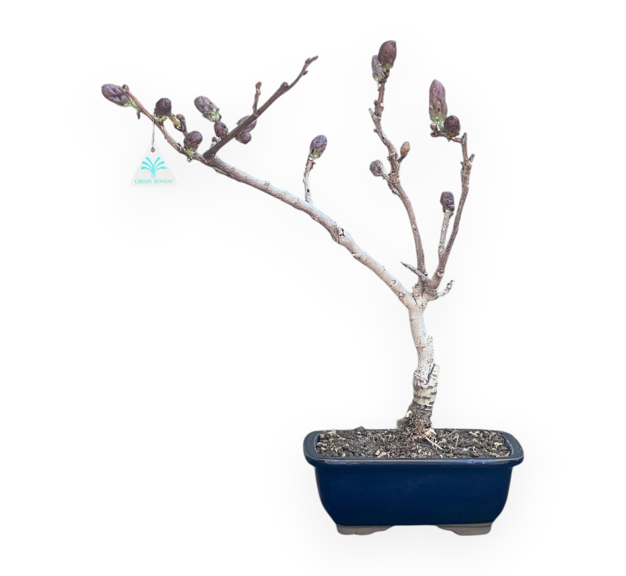 Bonsai von Wisteria floribunda, einer sommergrünen blühenden Art, die für ihre spektakuläre Frühjahrsblüte bekannt ist. Im Frühjahr produziert sie die charakteristischen Blütenknospen, die sich vor oder gleichzeitig mit den Blättern entwickeln. Die Blüte ist der spektakulärste Moment: Die langen, hängenden Trauben mit duftenden, violett-lilafarbenen Blüten wirken elegant und leicht. Die grünen Blätter öffnen sich allmählich und begleiten die Blüte, ohne sie jemals zu überlagern. Im Sommer, nach der Blüte, verdichtet sich die Vegetation zu einem volleren Laub, während sich die Blätter im Herbst gelb färben, bevor sie abfallen und die kahle Struktur des Bonsai wieder zum Vorschein kommt. Der Stamm ist leicht geneigt, was der Komposition Bewegung verleiht. Er wird in einem rechteckig blau glasierten Steingut Topf kultiviert, der einen eleganten Kontrast zu den Schattierungen des Laubes bildet und an die Blütentöne erinnert.
