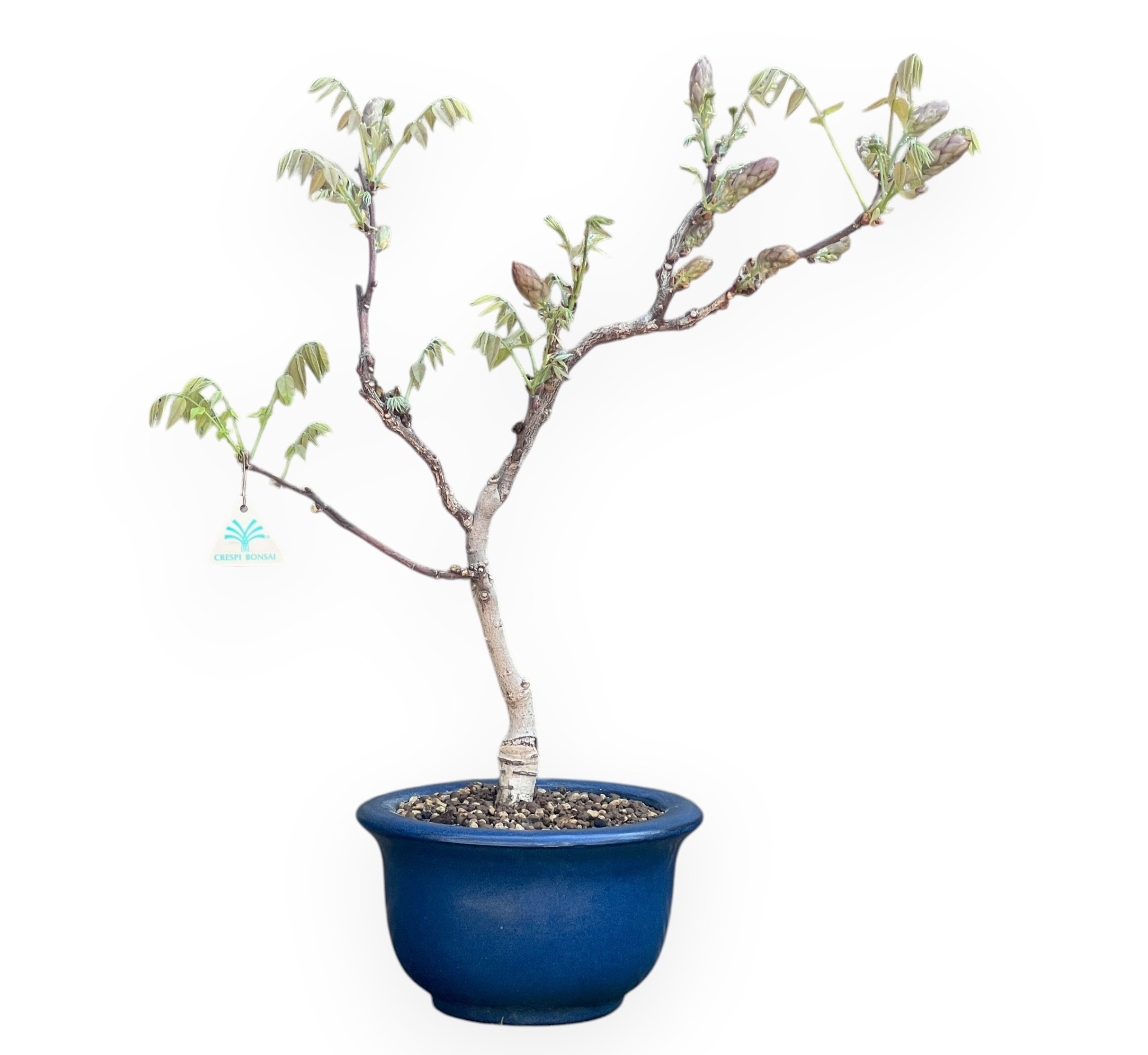Bonsai von Wisteria floribunda, einer sommergrünen blühenden Art, die für ihre spektakuläre Frühjahrsblüte bekannt ist. Im Frühjahr produziert sie die charakteristischen Blütenknospen, die sich vor oder gleichzeitig mit den Blättern entwickeln. Die Blüte ist der spektakulärste Moment: Die langen, hängenden Trauben mit duftenden, violett-lila farben Blüten wirken elegant und leicht. Die grünen Blätter öffnen sich allmählich und begleiten die Blüte, ohne sie jemals zu überlagern. Im Sommer, nach der Blüte, verdichtet sich die Vegetation zu einem volleren Laub, während sich die Blätter im Herbst gelb färben, bevor sie abfallen und die kahle Struktur des Bonsai wieder zum Vorschein kommt. Er wird in einem rund blau glasierten Steingut Topf kultiviert, der einen eleganten Kontrast zu den Schattierungen des Laubes bildet und an die Blütentöne erinnert.