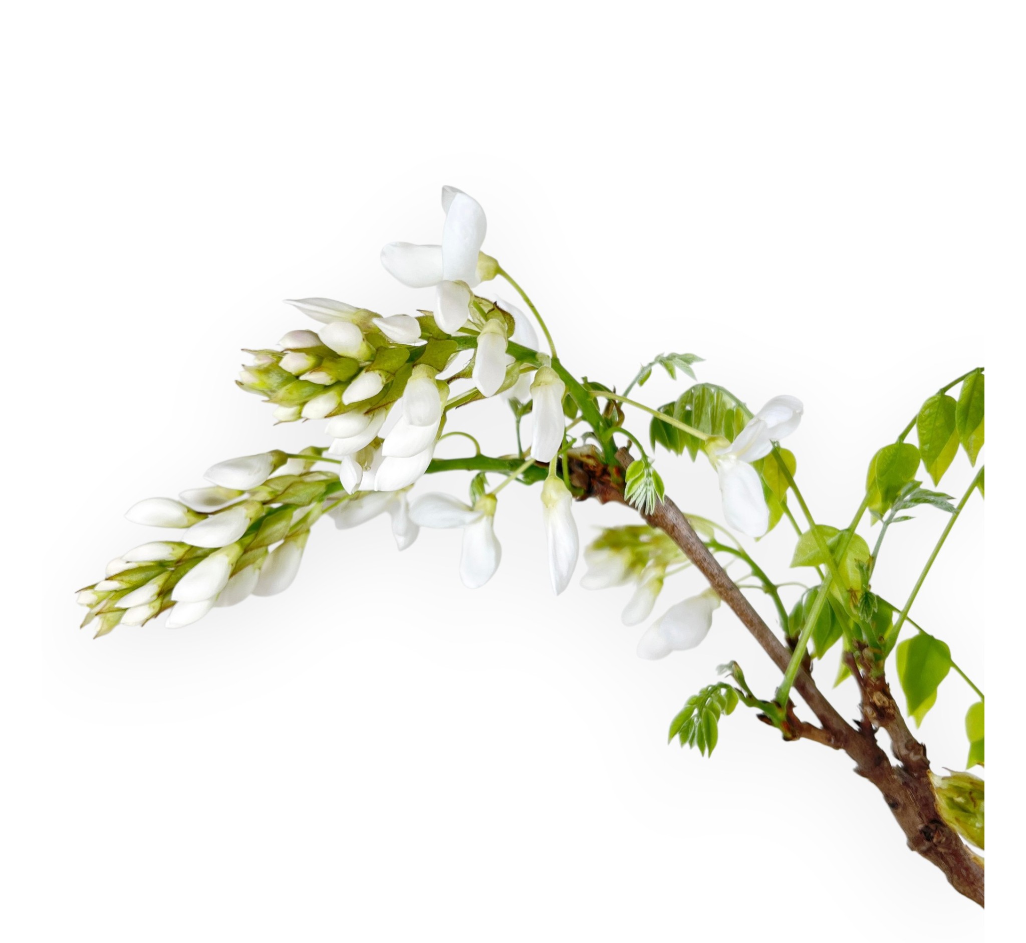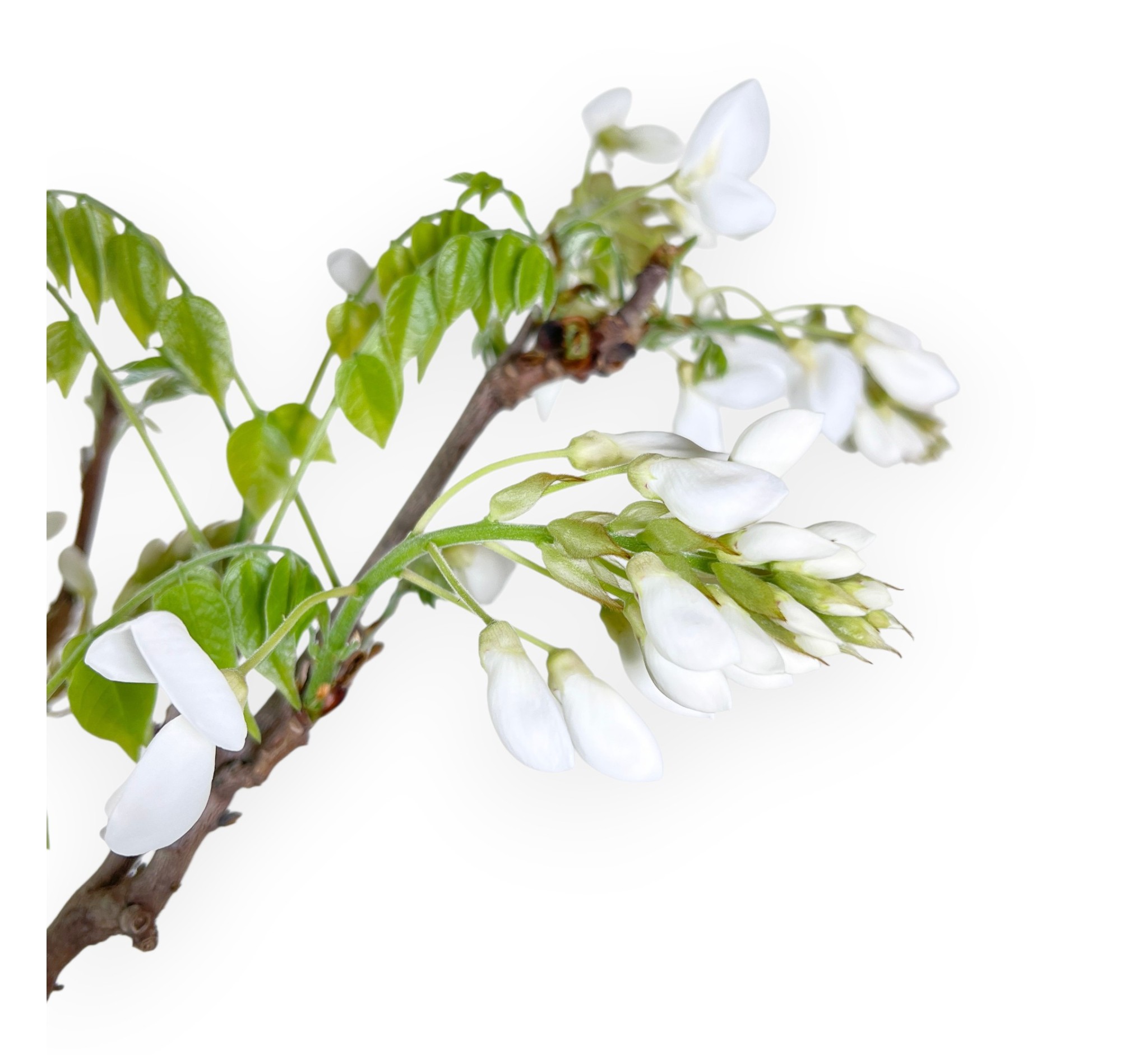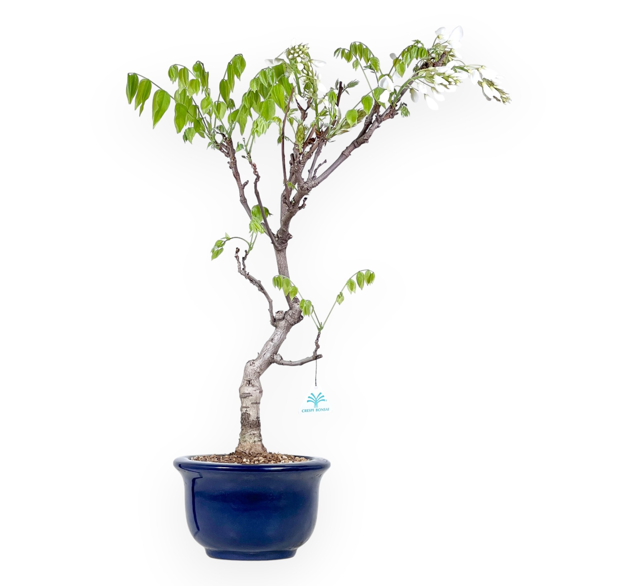Bonsai von Wisteria floribunda, einer sommergrünen blühenden Art, die für ihre spektakuläre Frühjahrsblüte bekannt ist. Im Frühjahr produziert sie die charakteristischen Blütenknospen, die sich vor oder gleichzeitig mit den Blättern entwickeln. Die Blüte ist der spektakulärste Moment: Die langen, hängenden Trauben mit duftenden, weiß farben Blüten wirken elegant und leicht. Die grünen Blätter öffnen sich allmählich und begleiten die Blüte, ohne sie jemals zu überlagern. Im Sommer, nach der Blüte, verdichtet sich die Vegetation zu einem volleren Laub, während sich die Blätter im Herbst gelb färben, bevor sie abfallen und die kahle Struktur des Bonsai wieder zum Vorschein kommt. Der Stamm ist leicht geneigt, was der Komposition Bewegung verleiht. Er wird in einem rund blau glasierten Steingut Topf kultiviert, der einen eleganten Kontrast zu den Schattierungen des Laubes bildet und an die Blütentöne erinnert.