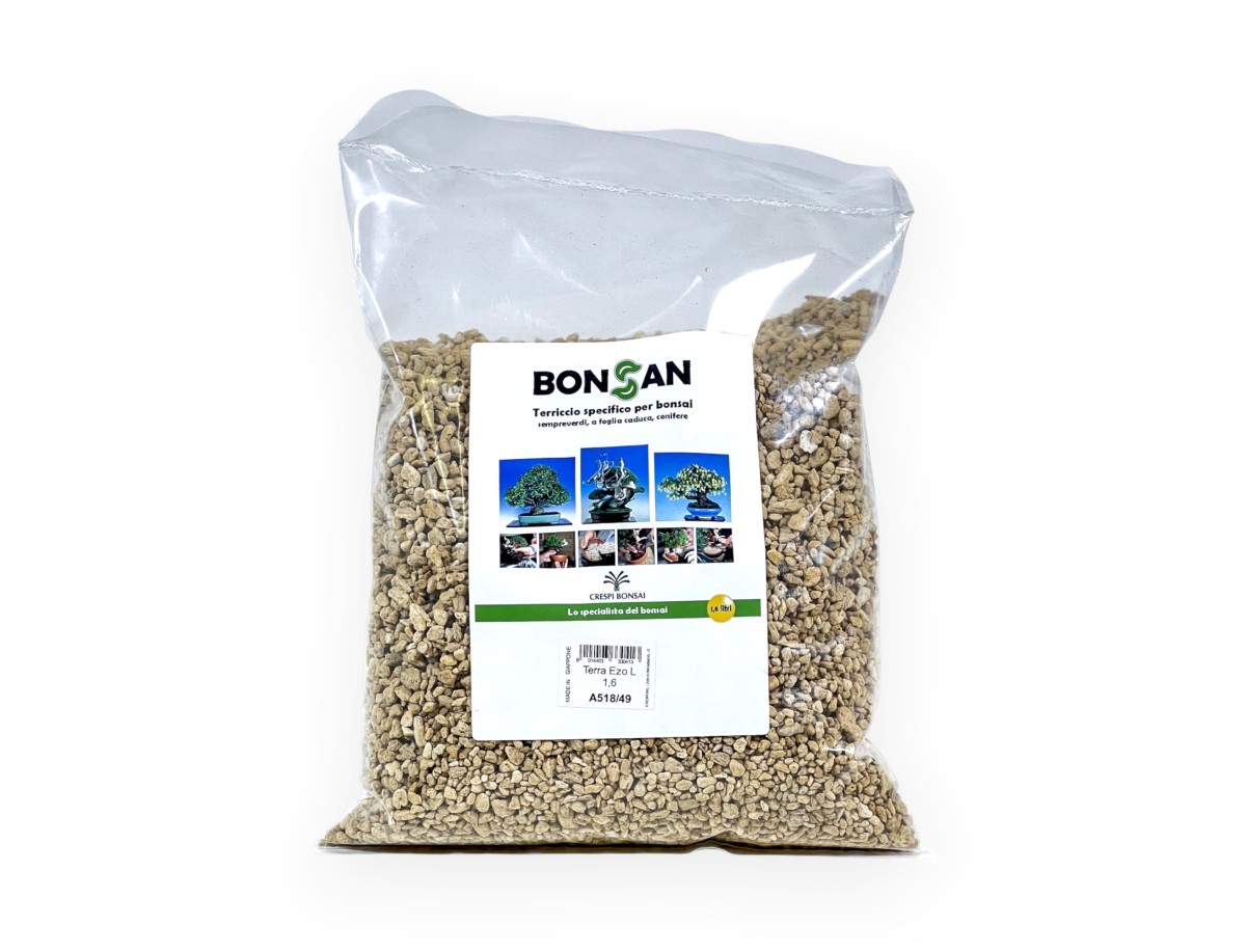 Ihre Körner sind hart, leicht, sehr porös und bröckeln nicht. Ezo-Erde wird wegen ihrer porösen und leichten Struktur geschätzt, die eine gute Wasserableitung und Luftzirkulation um die Bonsaiwurzeln herum ermöglicht. Sie hat einen neutralen pH-Wert und zersetzt sich nicht mit der Zeit