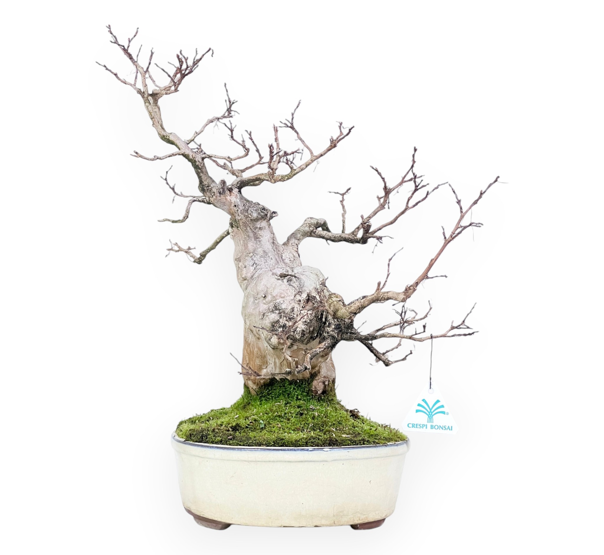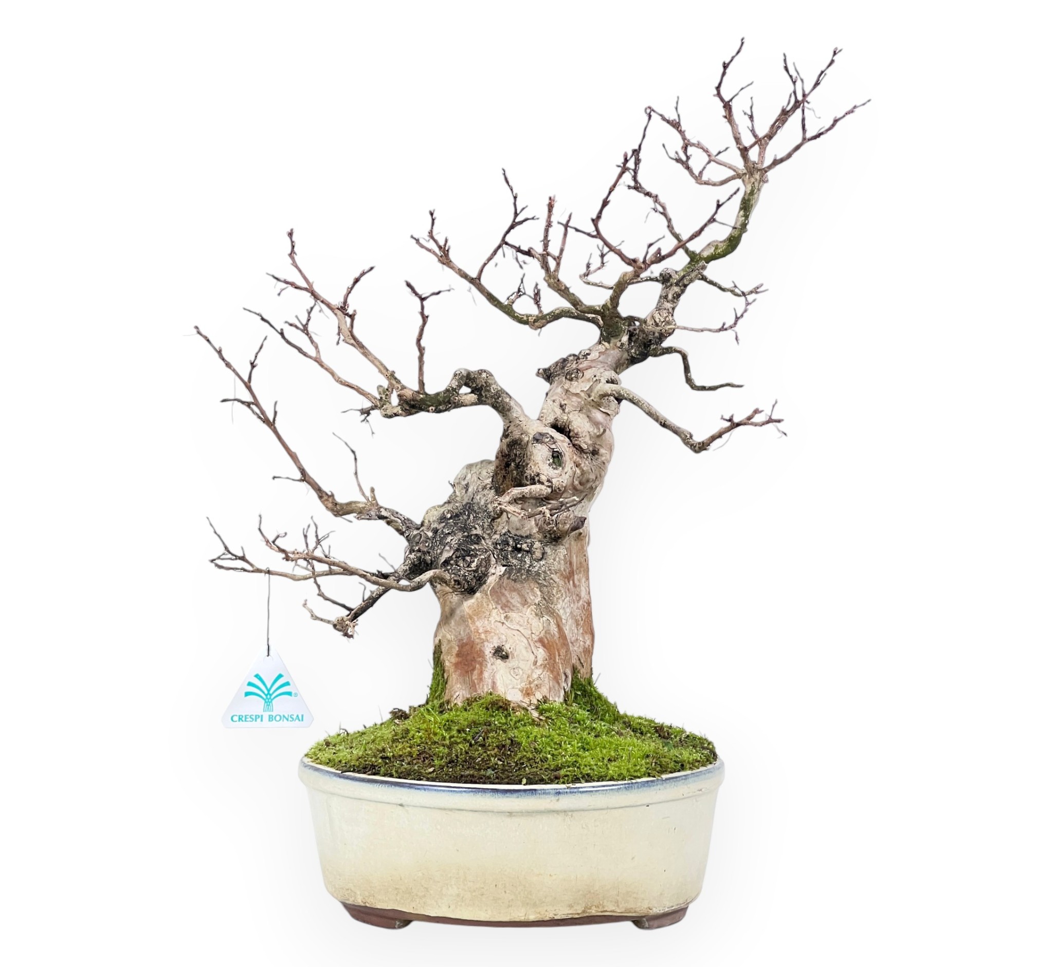 Lagerstroemia bonsai (Kreppmyrte), ein sommergrüner Zierbaum, der besonders für seine spektakuläre Sommerblüte geschätzt wird, die sich durch helle, gekräuselte Blütenstände in violett-rosa Tönen auszeichnet, die dem Laub eine große Lebendigkeit und Raffinesse verleihen. Im Frühjahr entwickelt sie kleine, wohlproportionierte, leuchtend grüne Blätter, die sich im Herbst in warme gelb-orange Töne verwandeln, bevor sie abfallen. Im Winter unterstreicht das vollständige Abwerfen des Laubes die elegante Silhouette und die feine, gut verteilte und harmonische Verzweigung. Der Stamm ist kräftig und lebendig, mit natürlichen Kurven. Die helle, leicht abblätternde Rinde verleiht dem Baum einen zusätzlichen ästhetischen Wert und erinnert an das reife Aussehen der Exemplare in der Natur. Der Nebari ist deutlich sichtbar und trägt zu einer soliden visuellen Basis bei. Der Bonsai steht in einem ovalen Topf aus glasiertem Steingut in hellen, zarten Tönen, die mit der Rinde und dem Oberflächenmoos harmonieren.