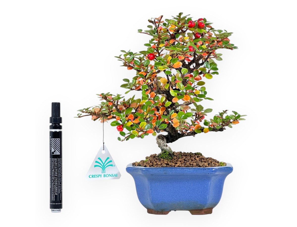Dieser Shohin-Bonsai aus Cotoneaster Horizontalis (Zierbeere) gehört zu den laubabwerfenden Obstsorten und ist in der Welt der Bonsai wegen seines kompakten Wachstums, seiner dichten Verzweigung und seiner kleinen, ovalen, glänzenden und intensiv grünen Blätter beliebt. Im Frühling wird er wegen seiner kleinen weiß-rosa Blüten geschätzt. Im Herbst und Winter färbt sich das Laub rot, und die Pflanze schmückt sich mit zahlreichen roten Beeren, die dekorativ und langlebig sind, ihren saisonalen Charme unterstreichen und sie auch als Zierfruchtbonsai perfekt machen. Der schlanke, geschwungene Stamm und die gleichmäßig verteilte Krone vermitteln ein Gefühl von natürlicher Ausgewogenheit und Eleganz. Der Bonsai wird in einem kobaltblau glasierten Steingut-Topf mit rechteckiger Form und abgerundeten Ecken kultiviert, der einen schönen Kontrast zum leuchtenden Grün der Blätter und dem leuchtenden Rot der Beeren bildet. Ein perfekter Baum für alle, die einen pflegeleichten Bonsai mit viel optischer Ausstrahlung suchen.