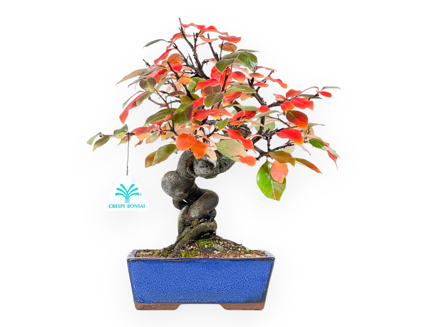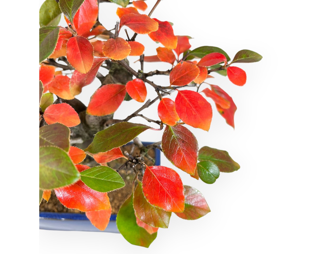 Dieser Bonsai von Pseudocydonia chinensis (Quitte) gehört zu den laubabwerfenden Obstbäumen, zeichnet sich durch ledrige Blätter und längliche, apfelförmige Früchte aus, deren Farbe bei der Reife von grün zu goldgelb wechselt. Die Frühjahrsblüten sind rosa-weiß und haben ein zartes, duftendes Aussehen. Das tiefgrüne Laub verfärbt sich im Herbst orangegelb und wirft im Winter seine Blätter ab. Der rechteckige leuchtend blau glasierte Steingut Topf bringt die Farben dieser Pflanze besonders gut zur Geltung. Kultiviert im Stil mit freiliegenden Wurzeln (Neagari), der die sichtbar verflochtenen und fest verankerten Wurzeln und ihre geschwungene Bewegung hervorhebt.