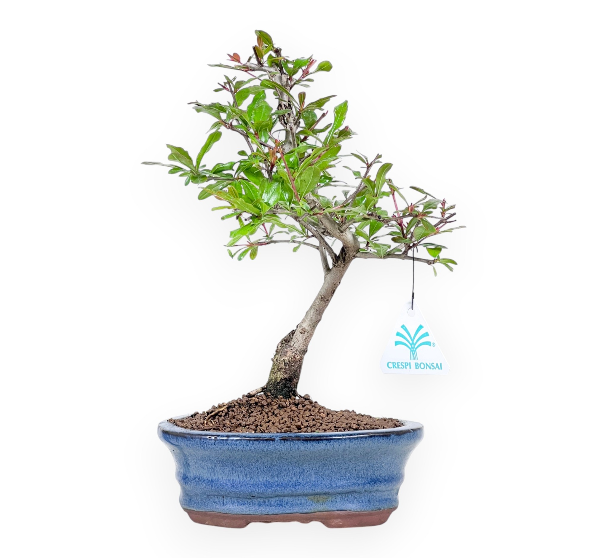 Bonsai von Punica granatum (granatapfel), einem laubabwerfenden Obstbaum, der für seine Fähigkeit geschätzt wird, Eleganz, Rustikalität und jahreszeitliche Spektakularität zu verbinden. Die kleinen, lanzettlichen Blätter erscheinen im Frühjahr mit sehr dekorativen rot-bronzefarbenen jungen Trieben, die während der Wachstumsperiode leuchtend grün sind und im Herbst warme gelb-orange Töne annehmen, bevor sie abfallen. Im Winter wirft die Pflanze ihre Blätter vollständig ab, wodurch die elegante Struktur des Stammes und der Äste betont wird. Im späten Frühjahr und im Sommer bildet sie leuchtend orange-rote Blüten mit einer charakteristischen und sehr dekorativen Form. Wenn sie unter den richtigen Bedingungen angebaut wird, folgen auf die Blüten Früchte, Granatäpfel, die gegen Ende des Sommers/Herbstes reifen und der Pflanze einen weiteren ästhetischen Wert verleihen. Wird in einen oval blau glasierten Steingut Topf, bildet einen raffinierten Kontrast zur Farbe der Vegetation und unterstreicht die Komposition mit Eleganz.