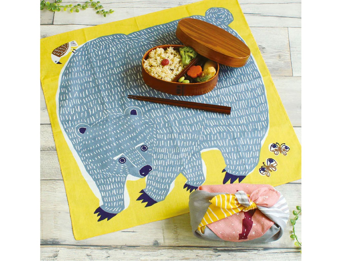 Furoshiki Kata Kata 50 x 50 cm – Illustration mit Bär, Vogel und Schmetterlingen – Gelber Hintergrund
