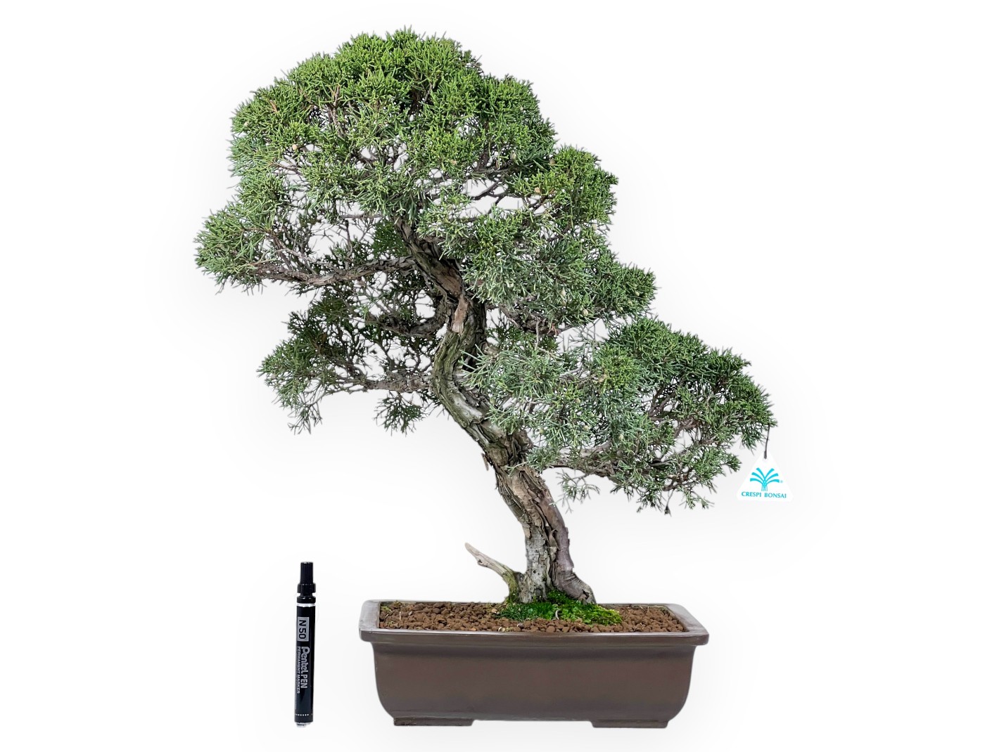 Wacholder Bonsai mit einer Höhe ohne Topf von 50 cm, einen Stammumfang von 5 cm und einen nebari de 10 cm. Die Pflanze wird in einen rechteckigen unglasierten Steingut Topf mit den Maßen 29x21xH9 cm gezogen.