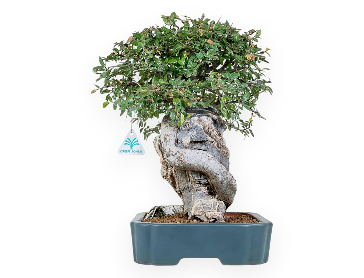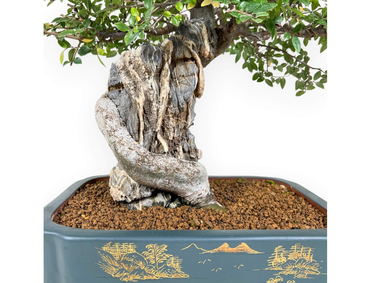 Dieser Bonsai von Ulmus Parviflora (Ulme) ist eine sommergrüne Art, die im Bonsaisektor wegen ihrer Widerstandsfähigkeit, ihres harmonischen Wachstums und ihrer dichten Verzweigung sehr geschätzt wird. Das kompakte und ausgewogene Laub, das aus kleinen gezähnten Blättern besteht, verleiht dem Bonsaibaum einen reifen und reichen Charakter. Das Laub färbt sich im Herbst orange-gelb und wirft im Winter seine Blätter ab. Dieses Exemplar steht auf einem Felsen stil (Seki-joju), wobei sich die Wurzeln an einem großen Stein in der Mitte festhalten und sich mit ihm verflechten, was einen natürlichen und symbolträchtigen Effekt erzeugt. Der kräftige Stamm wickelt sich mit einer eleganten und dynamischen Bewegung um den Felsen. Der Bonsai steht in einem rechteckigen petrolgrünen emaillierten Steingut Topf, der mit raffinierten goldenen Verzierungen verziert ist: Dargestellt sind eine Naturlandschaft und orientalische Schriftzeichen, die die Ästhetik des Bonsai unterstreichen.