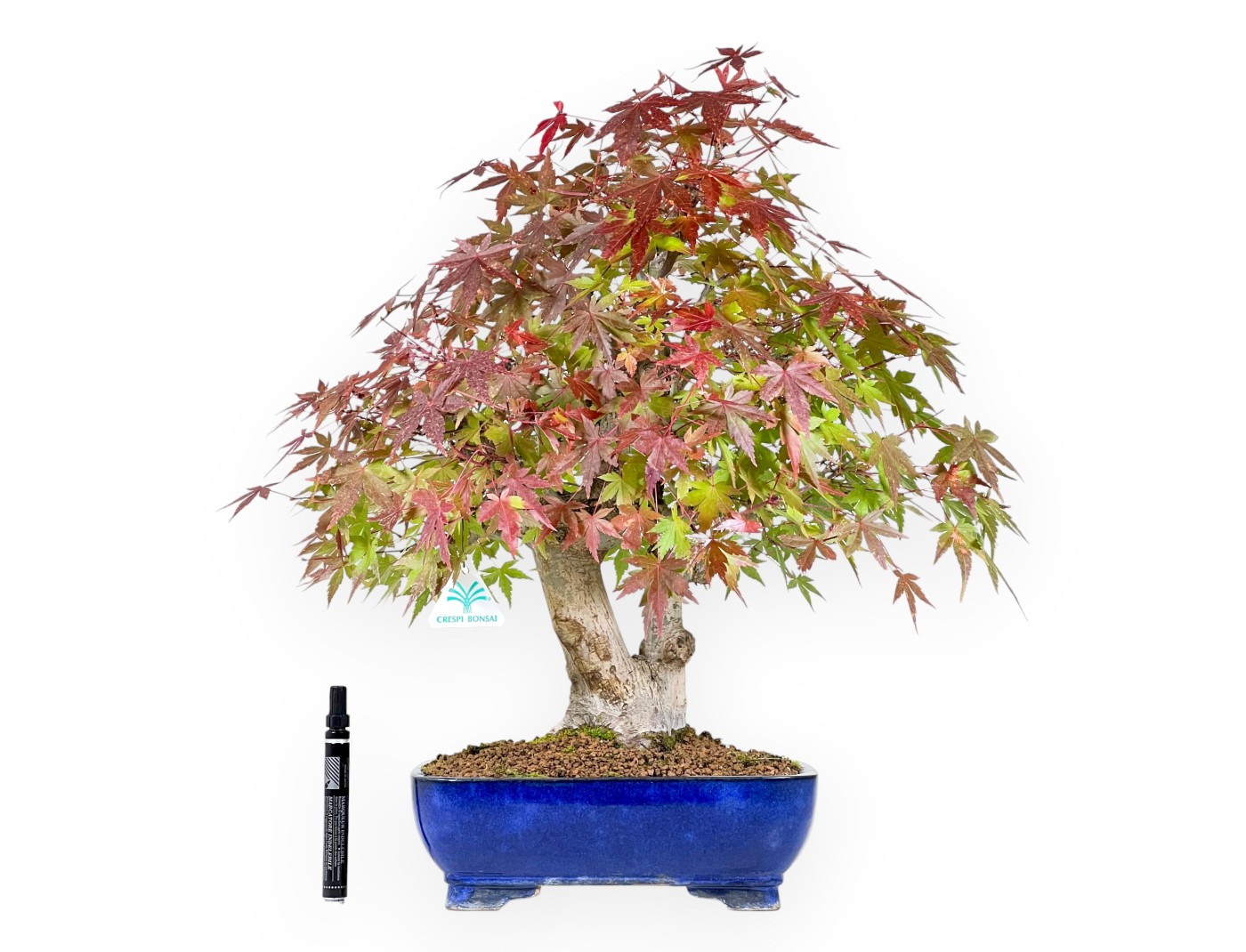 Dieser Bonsai aus Acer palmatum viridis (Ahorne) ist eine laubabwerfende Art, die für ihr exquisites Laub geschätzt wird, das im Laufe der Saison die Farbe wechselt, von tiefgrün über orange-gelbe Töne bis hin zu tiefrot im Herbst, und im Winter seine Blätter abwirft. Er wird im doppelstamm stil (Sokan) kultiviert, bei dem zwei Stämme parallel vom selben Nebari abzweigen, wodurch ein dynamisches und natürliches Gleichgewicht entsteht. Der rechteckige blau glasierte Steingut Topf bildet einen eleganten Kontrast zu den Schattierungen des Laubes und unterstreicht dessen Schönheit.