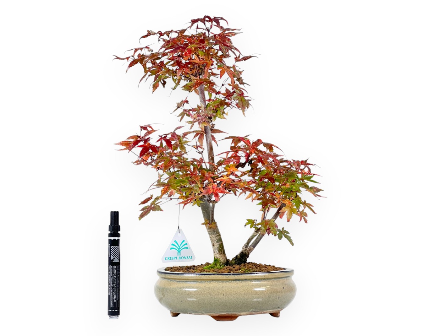 Ahorne Bonsai mit einer Höhe ohne Topf von 32,5 cm, einem Stammdurchmesser von 1 und 1,5 cm und einem nebari von 4 cm. Die Pflanze wird in einem oval Topf aus glasiertem Steingut mit den Maßen 17x13,5xH6,5 cm gezogen.