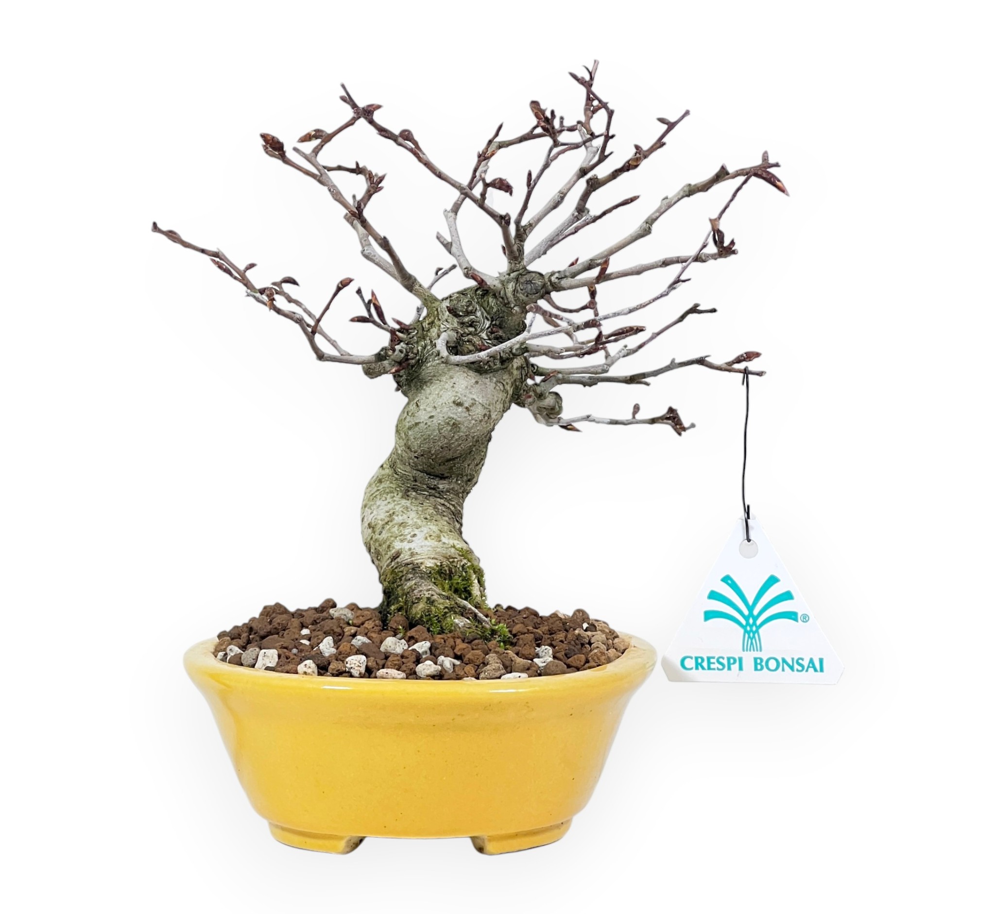 Shohin Bonsai aus Fagus crenata (Buche), einen laubabwerfende Art mit lanzettförmigen Blättern. Das leuchtend grüne Laub verfärbt sich im Herbst orange-gelb bis braun und wirft im Winter seine Blätter ab. Der Stamm hat eine solide Basis und eine harmonische, ausgewogene Verzweigung, wodurch die Pflanze Eleganz und Stärke ausstrahlt. Der informelle aufrechte Stil (Moyogi) zeichnet sich durch einen leicht gebogenen Stamm aus, der Stärke und Stabilität zeigt. Die Verzweigung entwickelt sich in geordneter und ausgewogener Weise, wodurch die Pflanze eine natürliche Eleganz ausstrahlt. Wird in einem oval gelb glasierten Steingut Topf kultiviert, bildet er einen subtilen Kontrast zum natürlichen Farbton des Stammes und der Wurzeln, der die Schönheit der Pflanze insgesamt unterstreicht.