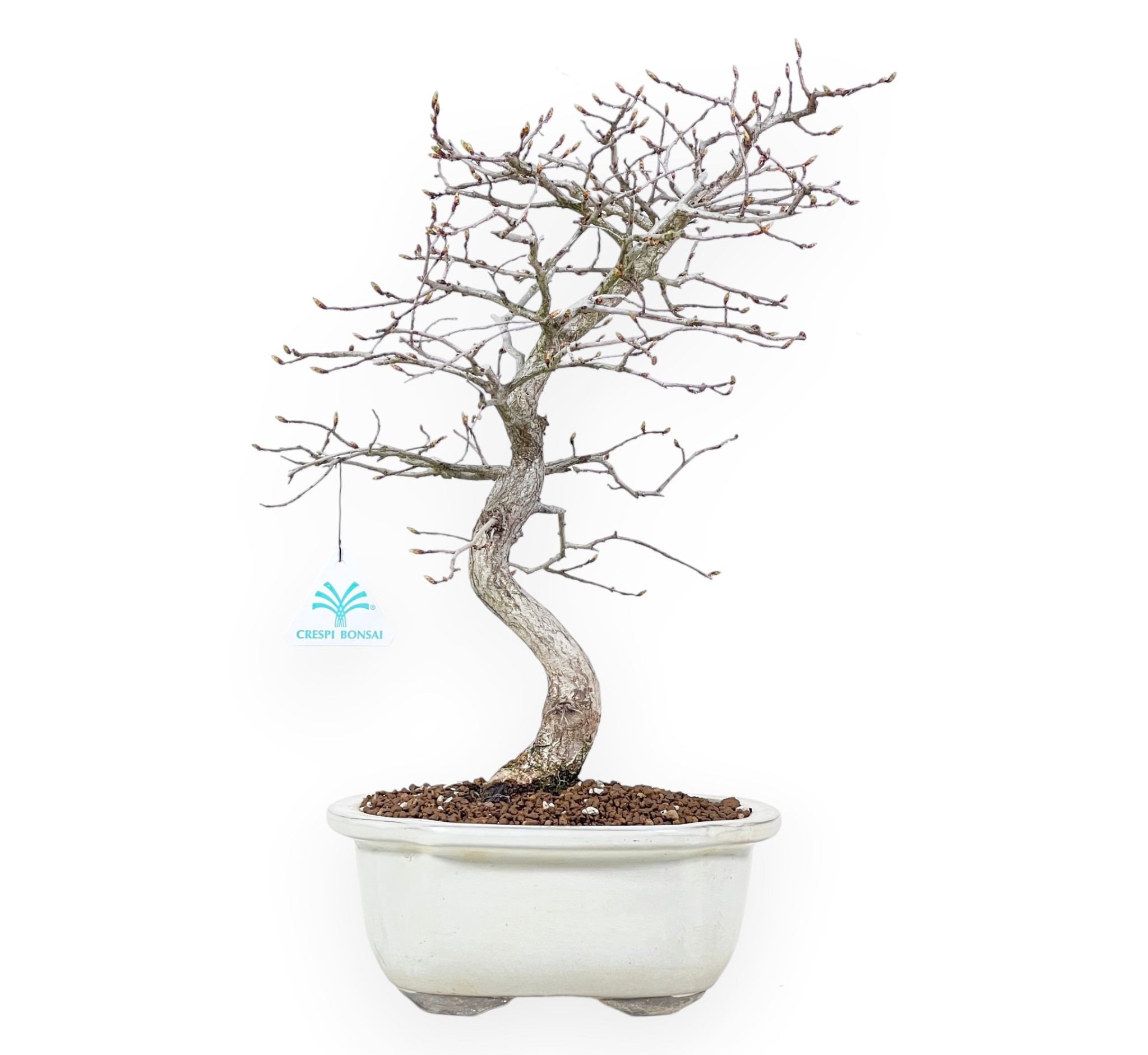 Bonsai von Carpinus turczaninovii (Hainbuche), laubabwerfend, wird für seine helle Rinde und hellgrünen, gezackten Blätter geschätzt. Das Laub verfärbt sich im Herbst goldgelb bis bräunlich-orange und fällt im Winter ab, was ihm ein sehr dekoratives Aussehen verleiht. Die Struktur entwickelt sich mit einer sanften Kurve entlang des Stammes auf harmonische und natürliche Weise, die gut verteilten Äste verzweigen sich ausgewogen und schaffen eine Struktur, die dem Ganzen Tiefe verleiht. Die wolkenförmige Vase aus cremefarben glasiertem Steingut kontrastiert mit dem leuchtenden Grün der Blätter im Frühling und Sommer oder mit dem für den Herbst typischen Gelb-Orange.
