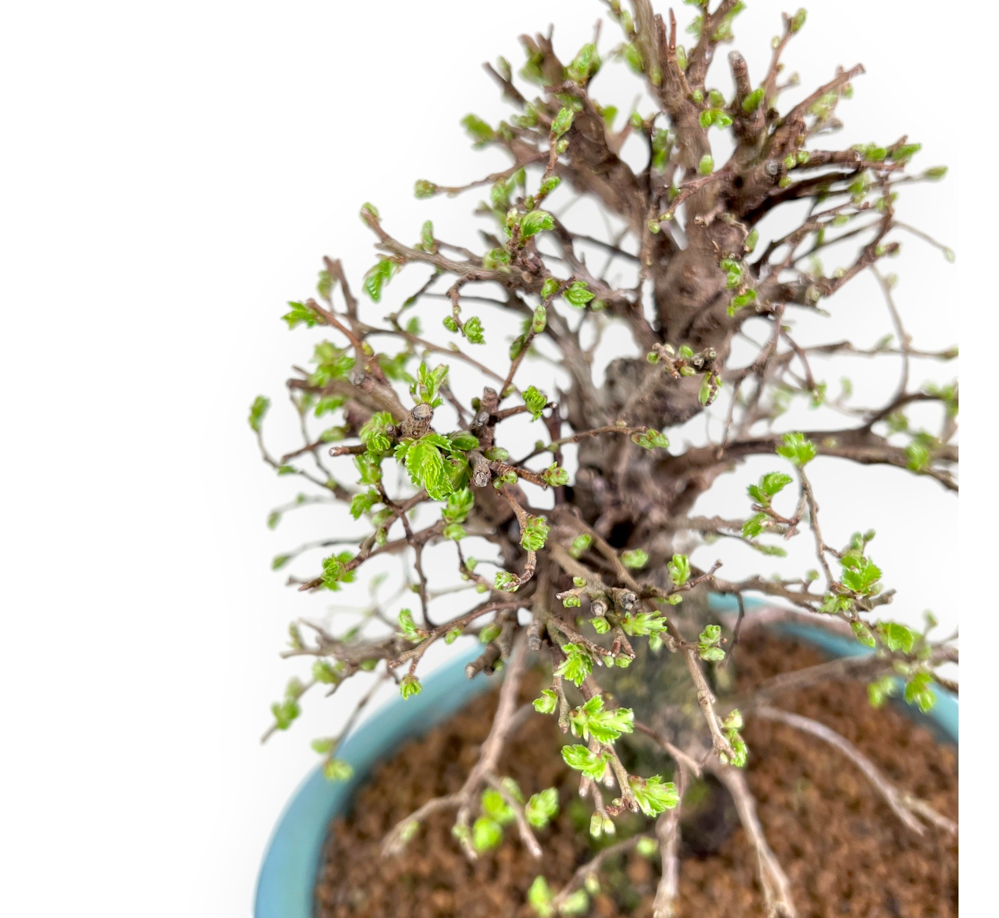 Ulmen bonsai mit einer Höhe ohne Topf von 17,5 cm, und einem Stammumfang von 3. Die Pflanze wird in einem oval glasierten Steingut Topf mit den Maßen 17,5x14,5xH6,5 cm gezogen.