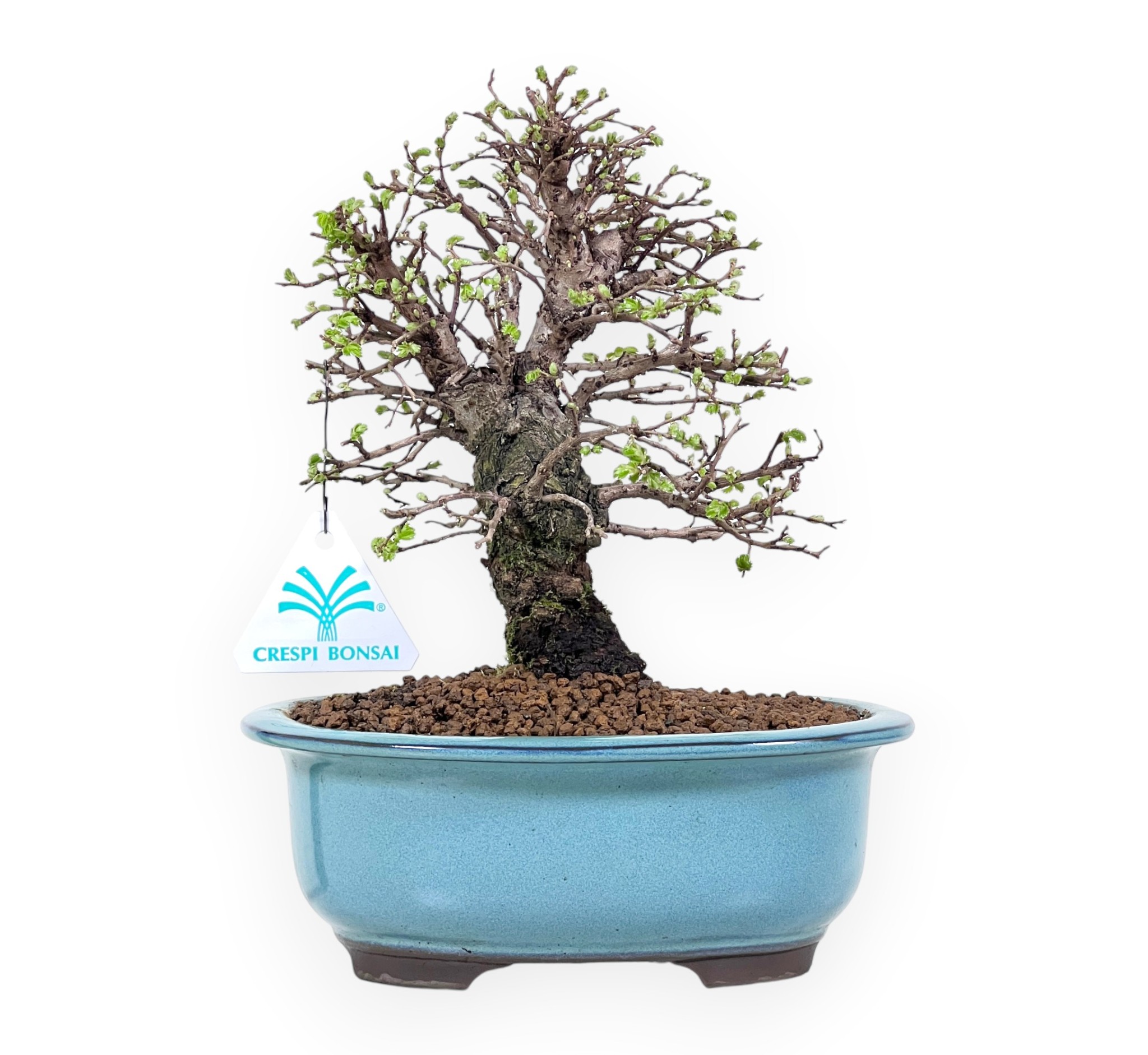 Bonsai shohin von Ulmus Parviflora (Ulme), laubabwerfende Art, die in der Bonsai-kultur wegen ihrer Widerstandsfähigkeit, ihres harmonischen Wachstums und ihrer dichten Verzweigung sehr geschätzt wird. Das kompakte und ausgewogene Laub, das aus kleinen, gezähnten Blättern besteht, verleiht dem Bonsaibaum einen reifen und reichen Charakter. Das Laub färbt sich im Herbst orange-gelb und wirft im Winter seine Blätter ab. Wird in einem oval türkis-grün glasierten Steingut Topf, der die leuchtende Farbe der Blätter und den dunklen Stamm perfekt zur Geltung bringt.