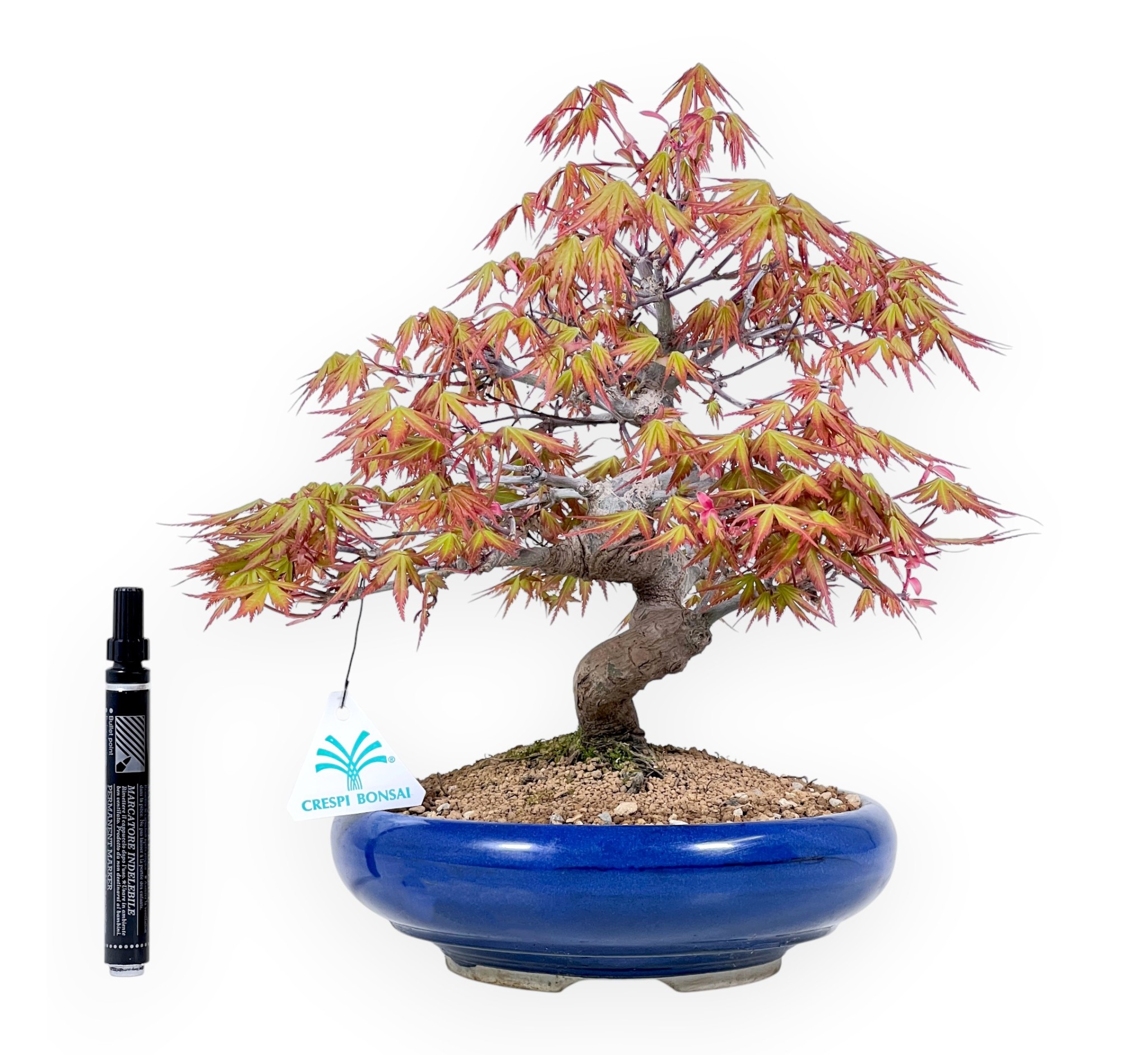 Dieser Bonsai aus Acer palmatum (Japanischer Ahorn) ist eine Laubbaumart, die für ihr zartes und fein gezeichnetes Laub geschätzt wird, das sich im Frühjahr in leuchtenden gelb-orangefarbenen Tönen präsentiert, sich im Laufe der Saison zu intensiveren und wärmeren Farben im Herbst entwickelt und dann im Winter seine Blätter abwirft. Der Baum zeichnet sich durch einen gewundenen, harmonischen Stamm aus, der sich mit eleganten Bewegungen entwickelt und der Pflanze Dynamik und Natürlichkeit verleiht. Die Verzweigung ist gut verteilt und sorgt für ein kompaktes, aber leichtes Laub, dessen feines Geweih die Feinheit der Blätter noch unterstreicht. Er wird in einem runden, tiefblau glasierten Keramiktopf gezüchtet, der einen raffinierten Farbkontrast zu den Farbtönen des Laubes bildet und zur allgemeinen Eleganz des Bonsai beiträgt.