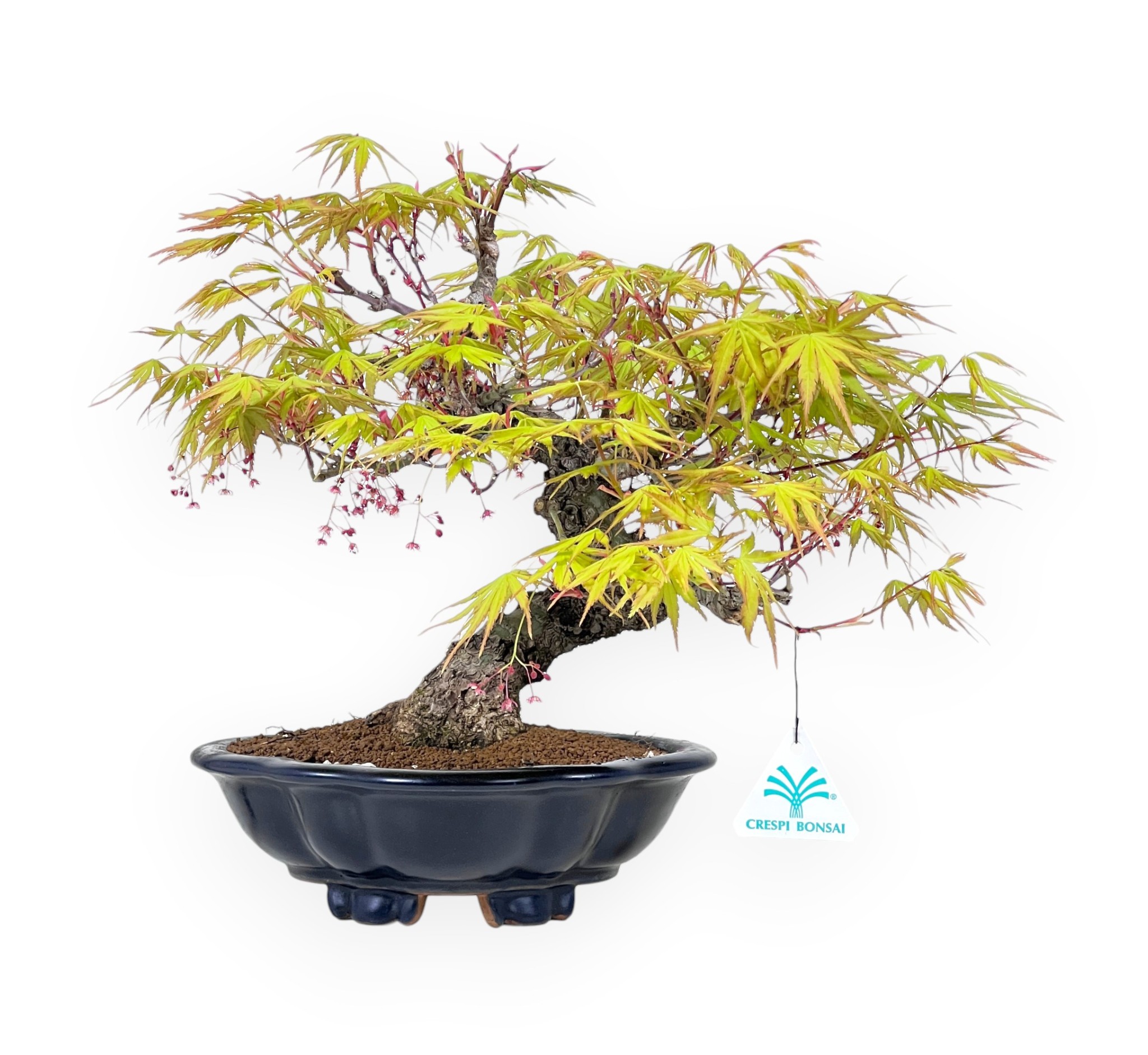 Dieser Bonsai von Acer palmatum Arakawa ist eine sommergrüne Art, die für ihr zartes und fein gezeichnetes Laub geschätzt wird, das sich im Frühjahr in lebhaften grün-gelben Tönen präsentiert, im Laufe der Saison zu intensiveren und wärmeren Farben im Herbst übergeht und im Winter seine Blätter abwirft. Der Baum hat einen charakteristischen faltigen, rindenartigen Stamm. Die stark zerklüftete Rinde vermittelt ein Gefühl von Reife und Rustikalität. Dieser Bonsai zeichnet sich durch einen gewundenen, harmonischen Stamm aus, der sich mit eleganten Bewegungen entwickelt und der Pflanze Dynamik und Natürlichkeit verleiht. Die Verzweigung ist gut verteilt und erzeugt ein kompaktes, aber leichtes Laub mit ordentlich angeordneten Geweihen, die die Feinheit der Blätter betonen. Er ist in einem dunkelblau glasierten Wolkentopf aus Keramik gepflanzt, der einen raffinierten Farbkontrast zu den Farbtönen des Laubes bildet und zur allgemeinen Eleganz des Bonsai beiträgt.