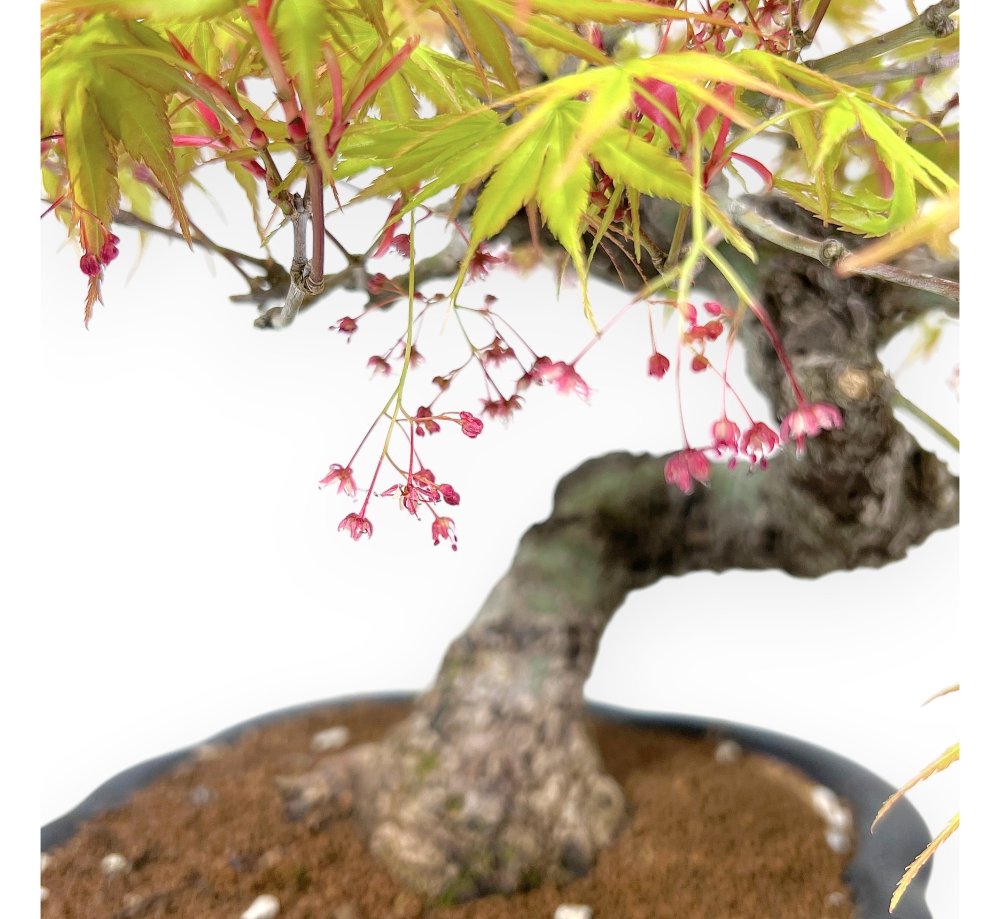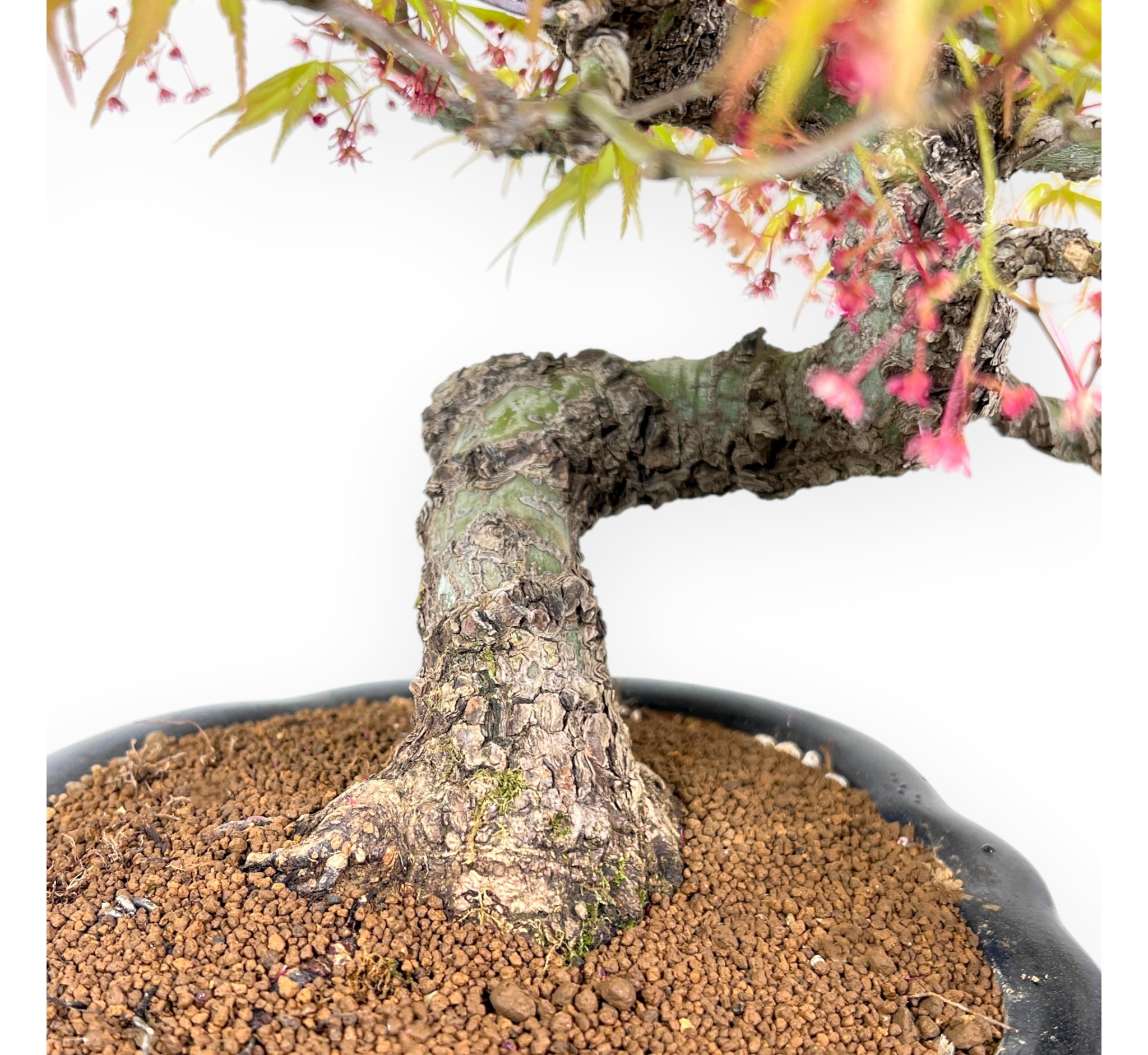 Acer palmatum Arakawa zeichnet sich durch seine Höhe ohne Topf von 23,5 cm, seinen Nebari von 6,5 cm und seinen Stammumfang von 3 cm aus. Die Pflanze wird in einem emaillierten Steingut-Wolkentopf mit den Maßen 20x18xH6,5 cm gezogen.