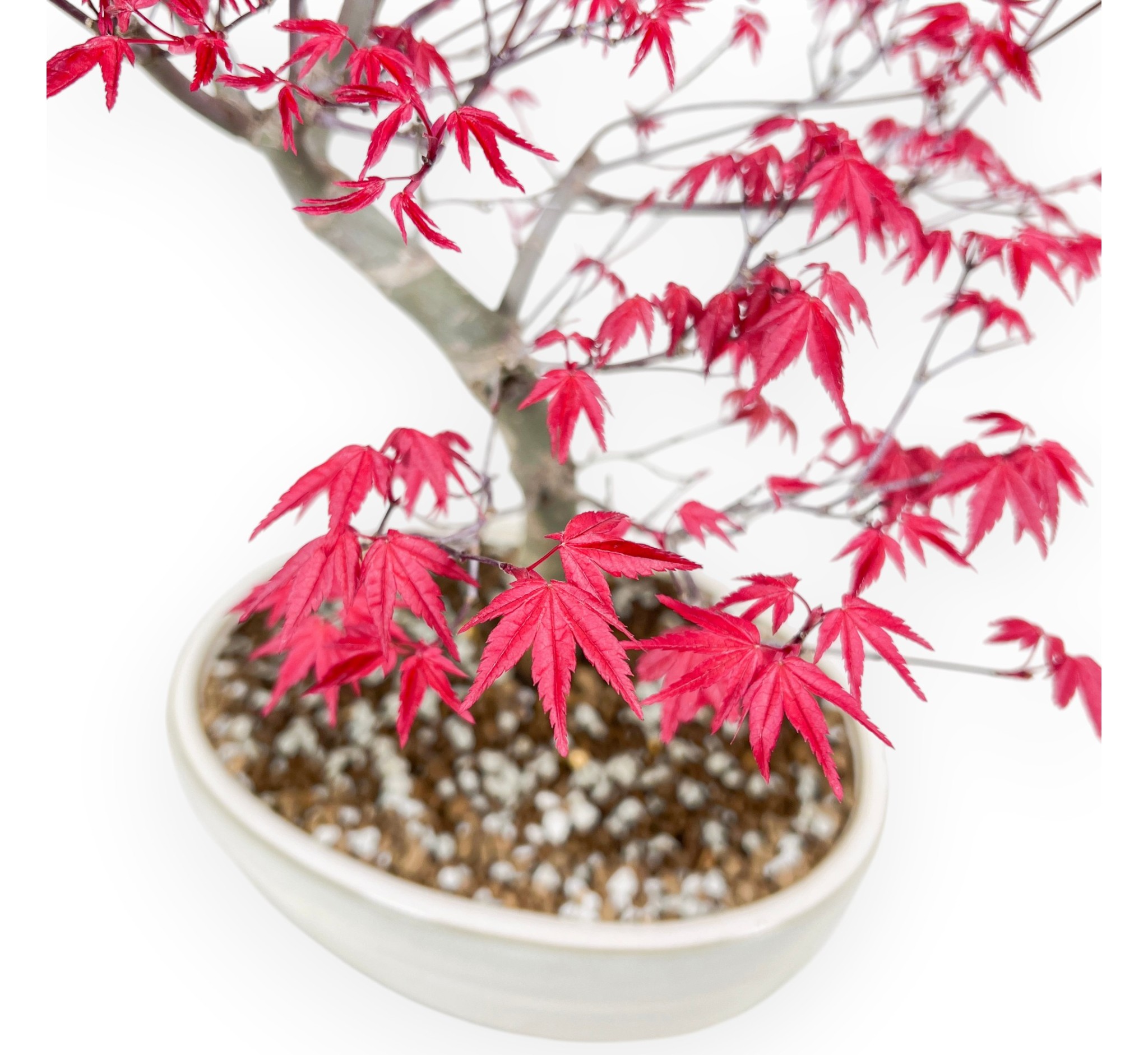Der Bonsai von Acer palmatum (ahorne), laubabwerfende Art, die für ihr exquisites Laub geschätzt wird, das im Laufe der Saison die Farbe wechselt, von tiefgrün über orange-gelbe Töne bis hin zu tiefrot im Herbst, und im Winter seine Blätter. Gepflanzt in einem creme oval glasierte Steingut Topf ergänzt den Bonsai, indem er die Schönheit der Pflanze hervorhebt und für Ausgewogenheit und Raffinesse.