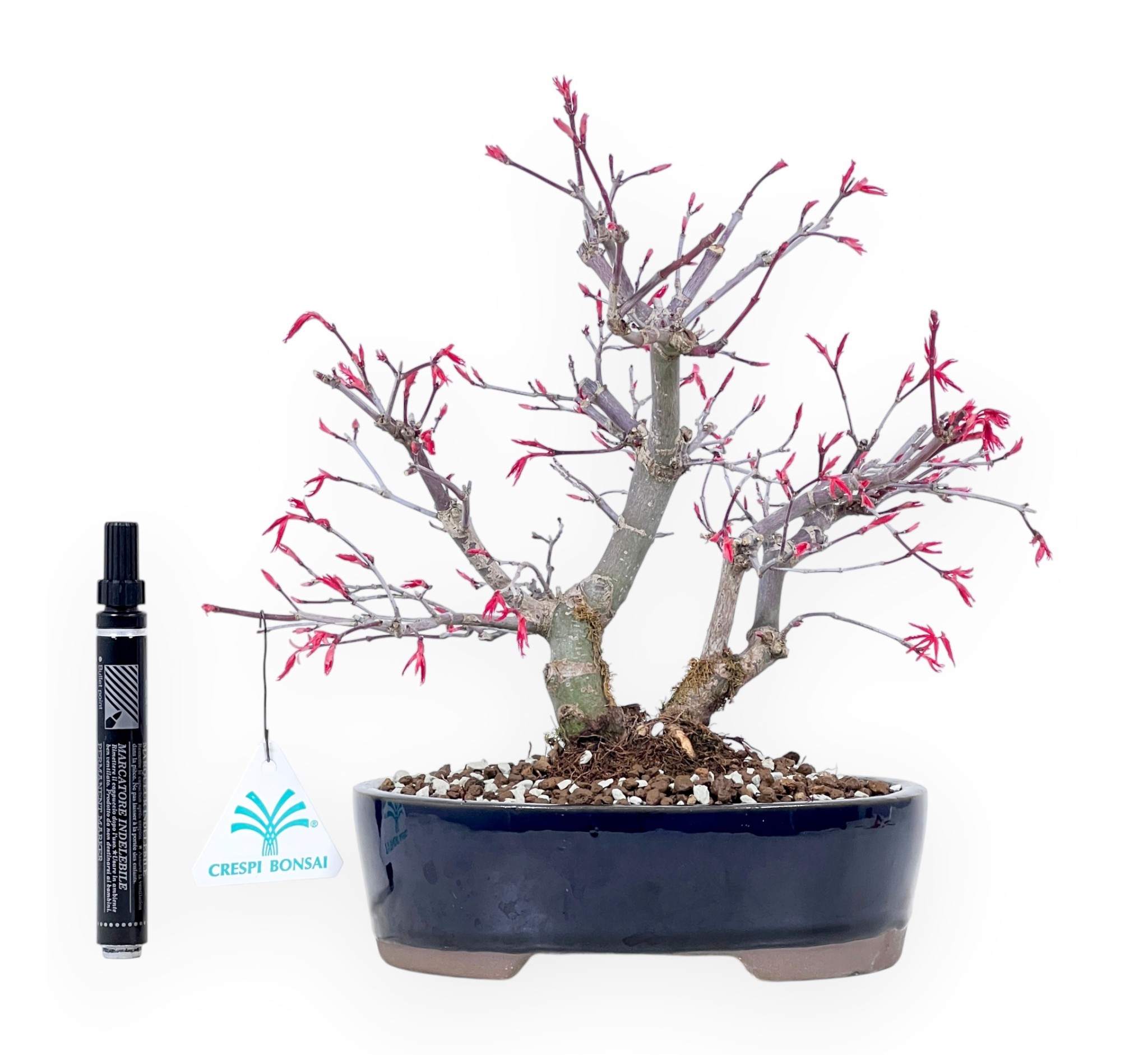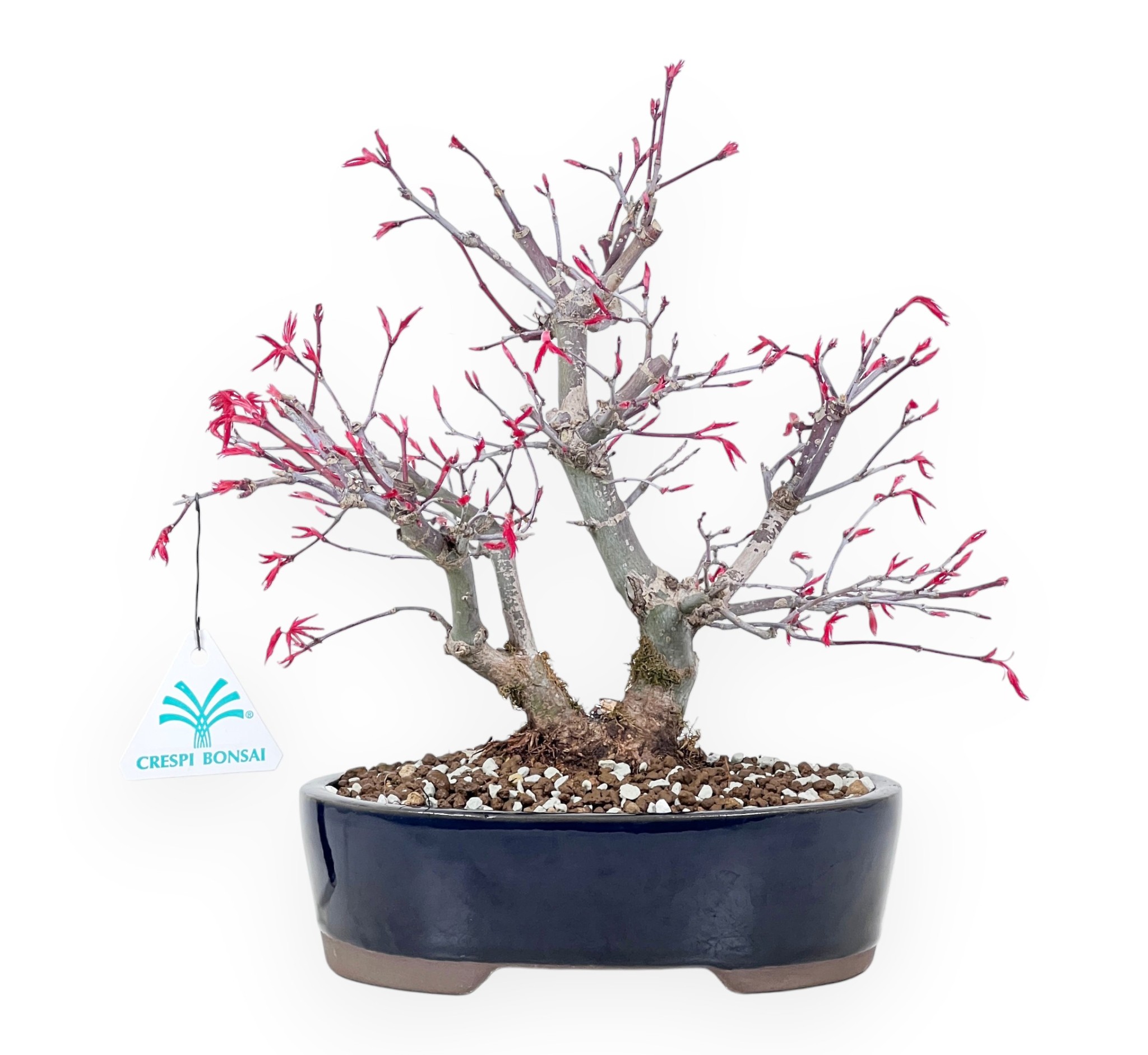 Bonsai aus Acer palmatum deshojo (Ahorn), eine Laubbaumart, die für ihre handförmigen Blätter mit lebhaften saisonalen Farbtönen bekannt ist. Das leuchtend rote Laub färbt sich im Herbst intensiv rot bis rot-orange und wirft im Winter seine Blätter ab. Er wird im Doppelstamm-Stil (Sokan), weist er zwei Stämme auf, die vom selben Nebari ausgehen und ein dynamisches, ausgewogenes Gleichgewicht schaffen. Der oval blau glasierten Steingut Topf, bildet einen raffinierten Kontrast zur Farbe der Vegetation und unterstreicht die Komposition mit Eleganz.