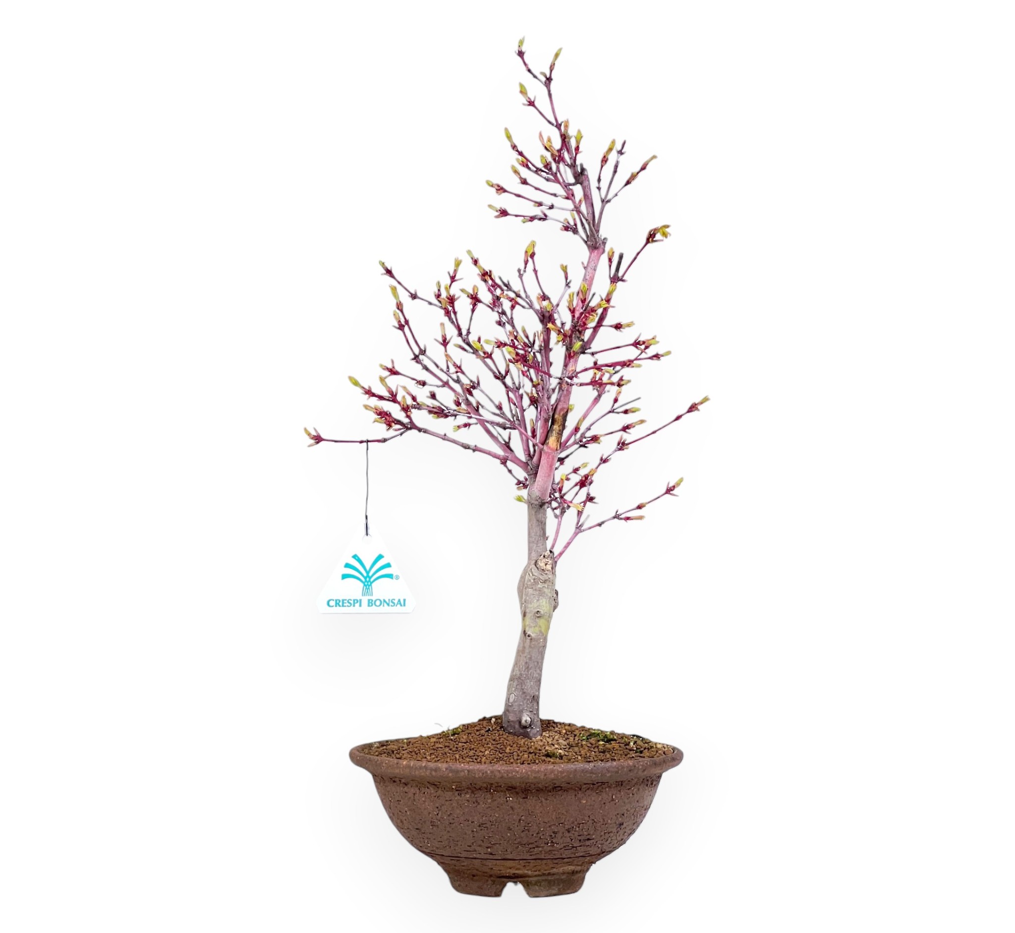 Bonsai von Acer palmatum Sangokaku, einer sommergrünen Art, die für ihre purpur-rote Rinde und ihr Laub, das sich im Laufe der Jahreszeiten verändert, geschätzt wird. Im Frühjahr sind die Blätter hellgrün, während sie sich im Sommer tiefgrün färben. Im Herbst färben sie sich in Rot- und Orangetönen und bieten ein optisches Spektakel. Im Winter verliert die Pflanze ihre Blätter, aber der rote Stamm und die Äste bleiben faszinierend. Eine ausgezeichnete Pflanze, um sich an der Herstellung eines eigenen Bonsai zu versuchen. Sie wird in einem runden unglasierten Steinguttopf gezüchtet, der einen raffinierten Farbkontrast zu den Laubschattierungen bildet und dem Bonsai ein Gefühl von Natürlichkeit verleiht.