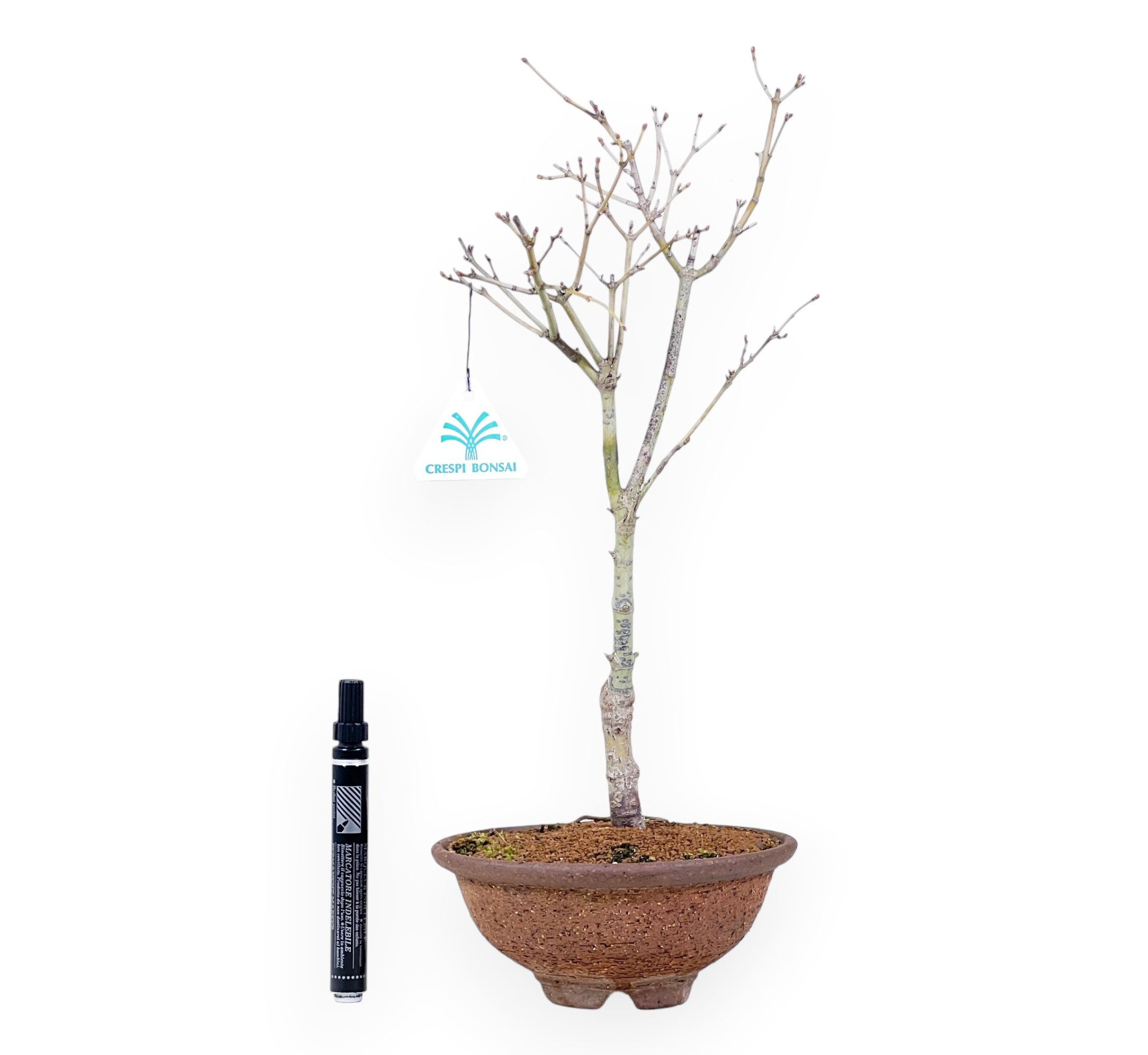 Bonsai von Acer palmatum Sigitachi-zawa ist eine laubabwerfende Art, die sich im Frühjahr durch intensive hellgrüne Farbtöne mit markanten dunkelgrünen Adern auszeichnet, die ein elegantes Netzmuster bilden. Im Laufe der Saison entwickelt er sich zu einem einheitlichen Grün im Sommer und zu einem orange-gelben Farbton im Herbst, bevor sie im Winter ihre Blätter abwirft. Eine ausgezeichnete Pflanze, um sich an der Bildung eines eigenen Bonsai zu versuchen. Sie wird in einem runden, unglasierten Steinguttopf gezogen, der einen raffinierten Farbkontrast zu den Laubtönen bildet und dem Bonsai ein Gefühl von Natürlichkeit verleiht.