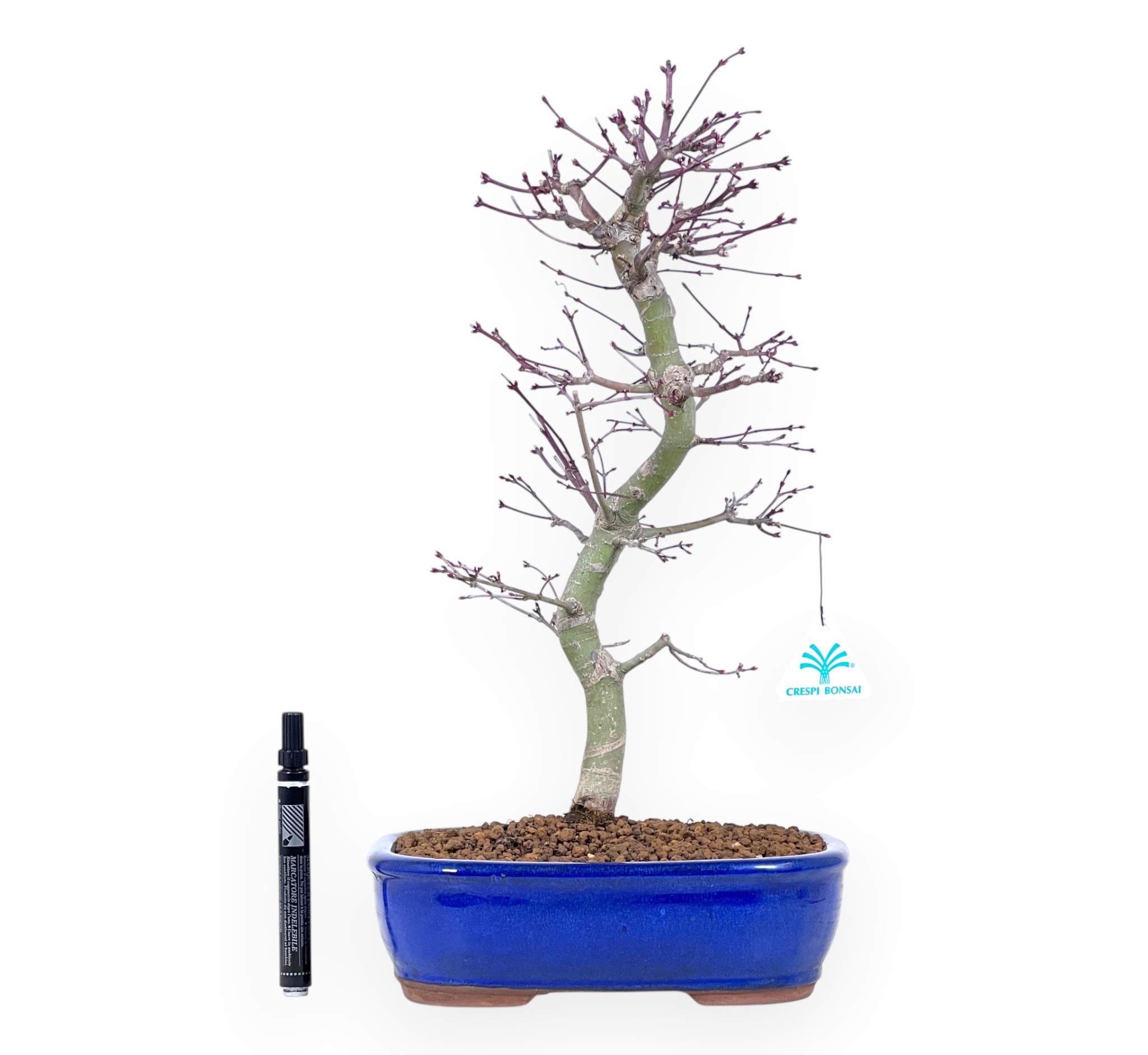 Dieser Bonsai aus Acer palmatum yukihire (Japanischer Ahorn) ist eine sommergrüne Art, die für ihr schlankes, spitz zulaufendes Laub geschätzt wird. In der warmen Jahreszeit ist es leuchtend grün, im Herbst färbt es sich in prächtigen Rot, Gelb und Orange tönen und bietet ein außergewöhnliches visuelles Schauspiel, bevor es im Winter seine Blätter abwirft. Der gewundene, harmonische Stamm entwickelt sich mit eleganten Bewegungen und verleiht der Pflanze Dynamik und Natürlichkeit. Kultiviert in einem oval blau glasierten Steinguttopf, der einen raffinierten Farbkontrast zu den Laubtönen bildet und zur allgemeinen Eleganz des Bonsai beiträgt.