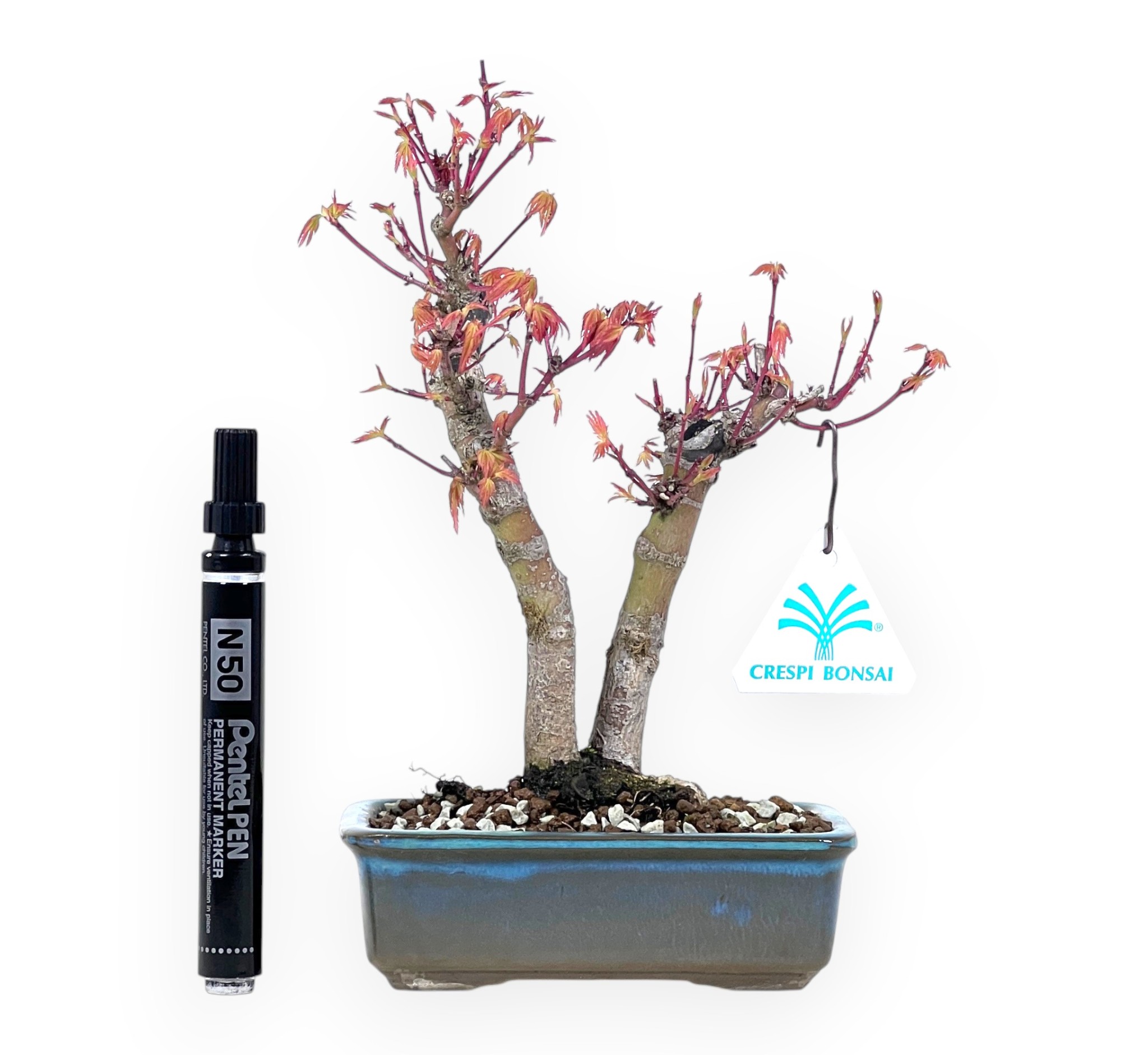 Der Acer palmatum Bonsai ist eine sommergrüne Art, die für ihre palmenförmigen Blätter mit leuchtenden Farbtönen bekannt ist. Das frühlingsrote Laub verfärbt sich im Herbst orangerot und wirft im Winter seine Blätter ab. Der Bonsai wird in einem Zwei-Pflanzen-Stil kultiviert und hat zwei Stämme, die eine dynamische und ausgewogene Komposition ergeben. Die ovale Vase aus blau-türkis glasiertem Steinzeug bildet einen raffinierten Kontrast zur Farbe der Vegetation und unterstreicht die Komposition mit Eleganz.