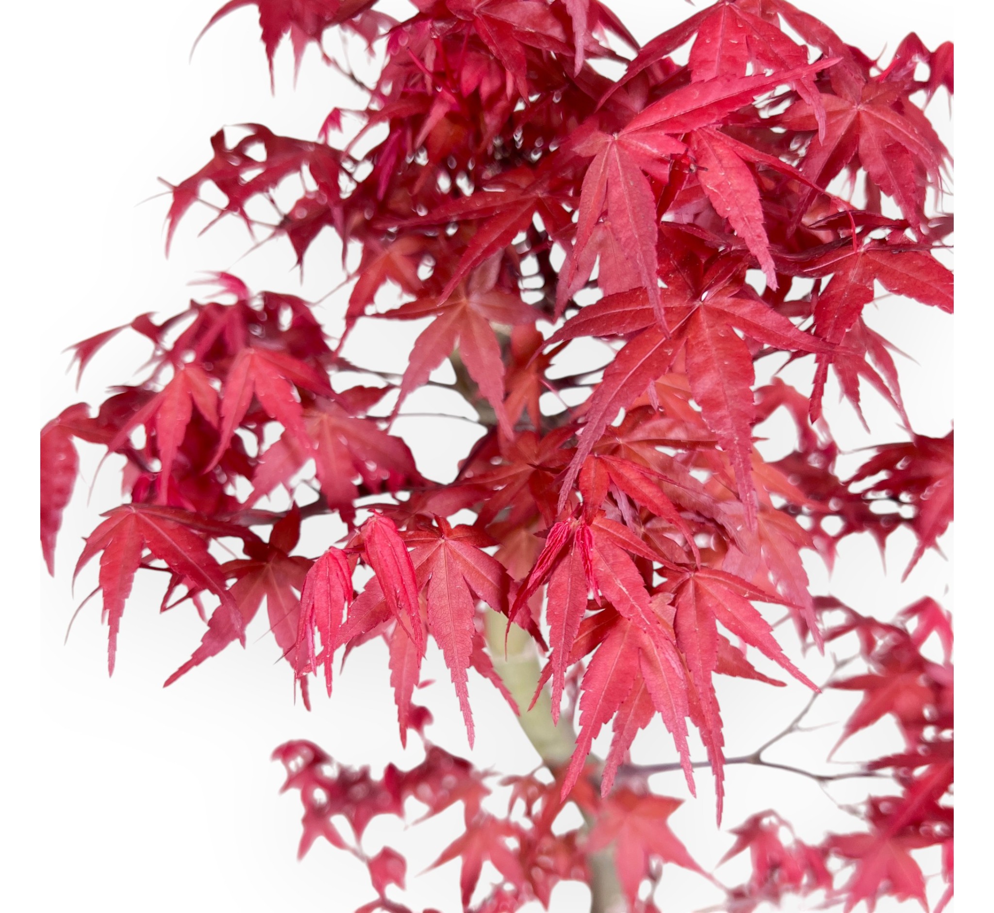 Bonsai aus Acer palmatum deshojo (Ahorn), eine Laubbaumart, die für ihre handförmigen Blätter mit lebhaften saisonalen Farbtönen bekannt ist. Das leuchtend rote Laub färbt sich im Herbst intensiv rot bis rot-orange und wirft im Winter seine Blätter ab. Er hat einen Stamm mit harmonischen Linien, der von einer zarten Verzweigung begleitet wird. Der oval türkis glasierten Steingut Topf, bildet einen raffinierten Kontrast zur Farbe der Vegetation und unterstreicht die Komposition mit Eleganz.