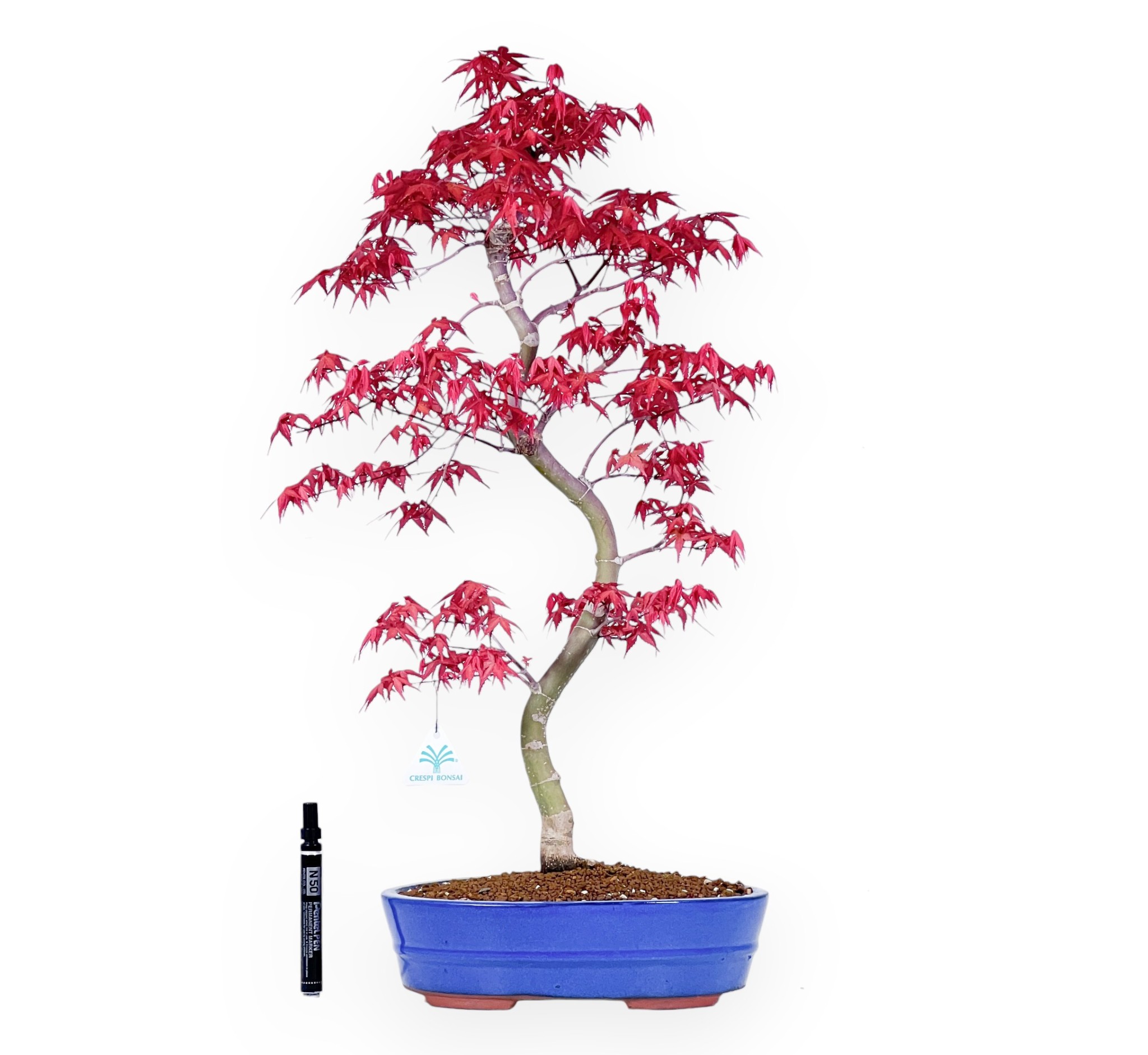 Bonsai von Acer palmatum deshojo (Ahorn), eine Laubbaumart, die für ihre handförmigen Blätter mit lebhaften saisonalen Farbtönen bekannt ist. Das leuchtend rote Laub färbt sich im Herbst intensiv rot bis rot-orange und wirft im Winter seine Blätter ab. Er hat einen Stamm mit harmonischen Linien, der von einer zarten Verzweigung begleitet wird. Der oval hellblau glasierten Steingut Topf, bildet einen raffinierten Kontrast zur Farbe der Vegetation und unterstreicht die Komposition mit Eleganz.