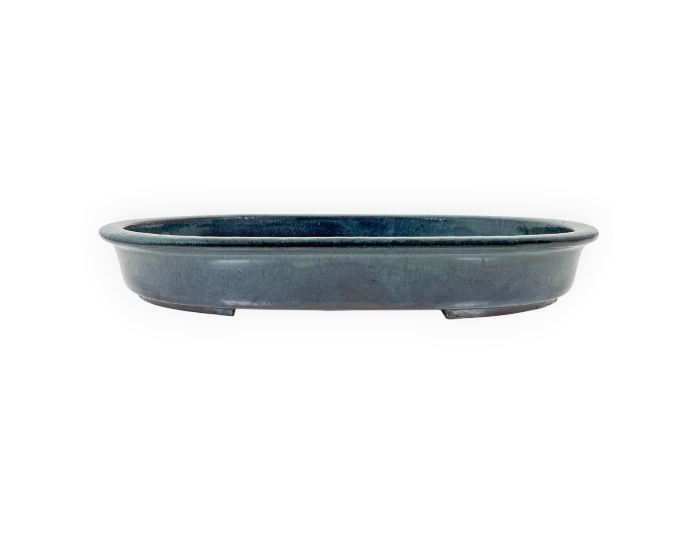 Chinesischer Bonsai-Topf, oval, aus grün glasiertem Steingut.