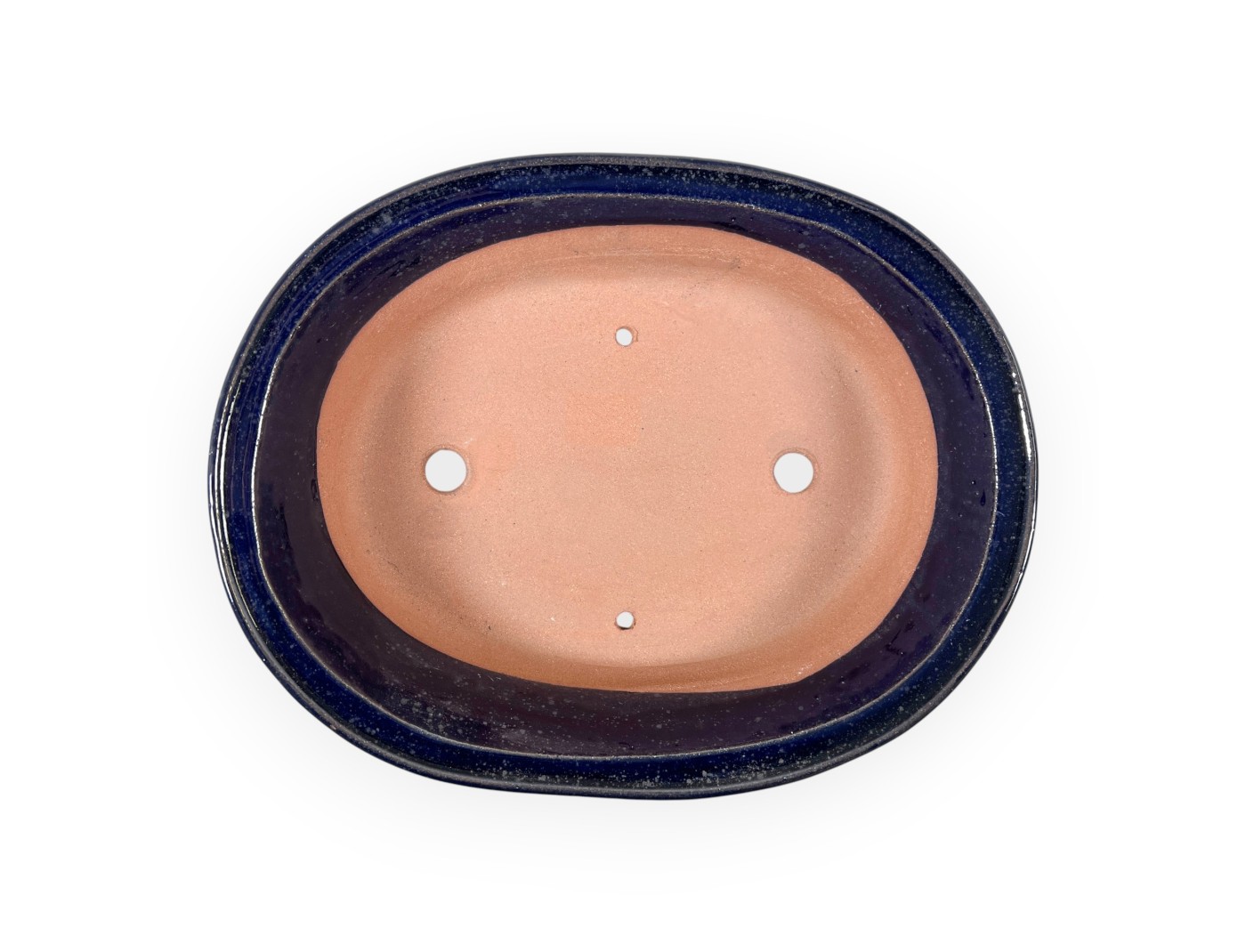 Chinesischer Bonsai-Topf, handgefertigt, oval, aus blau glasiertem Steingut.