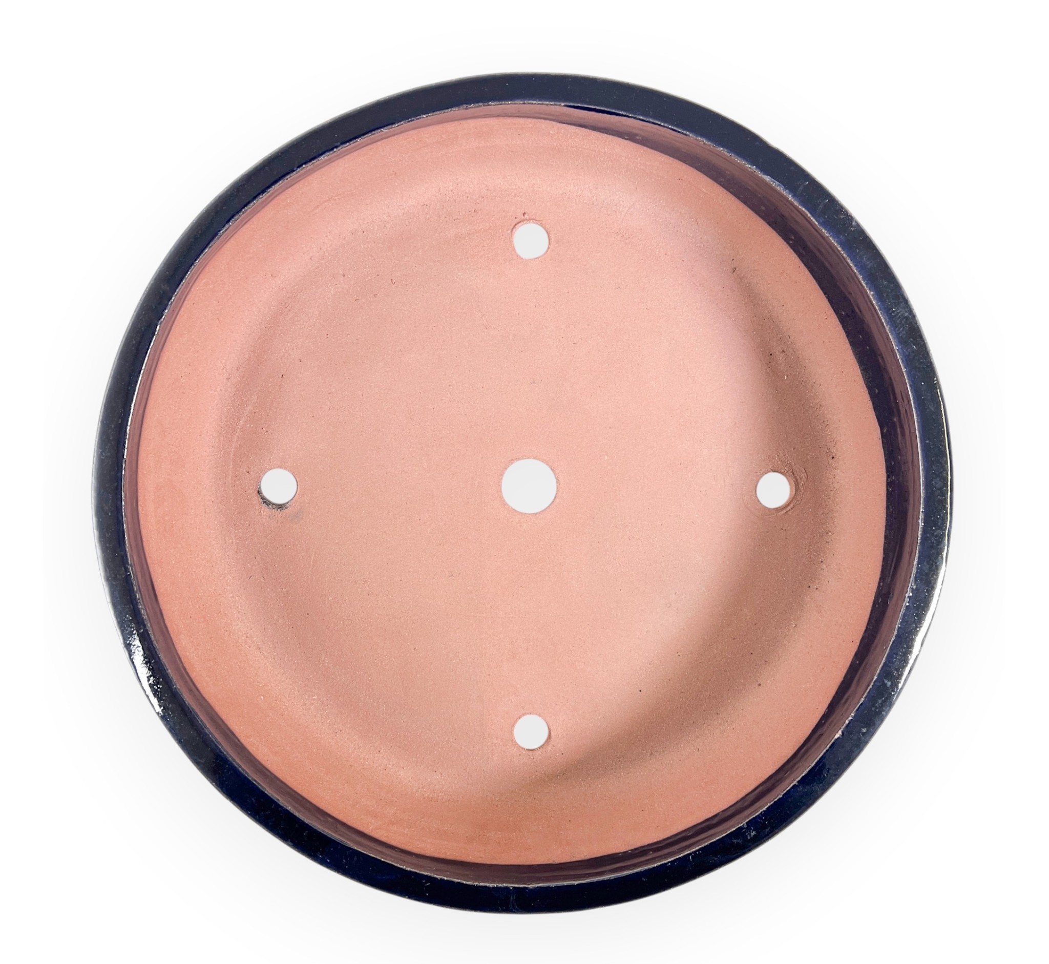 Chinesischer Bonsai-Topf, handgefertigt, rund, aus blau glasiertem Steingut.