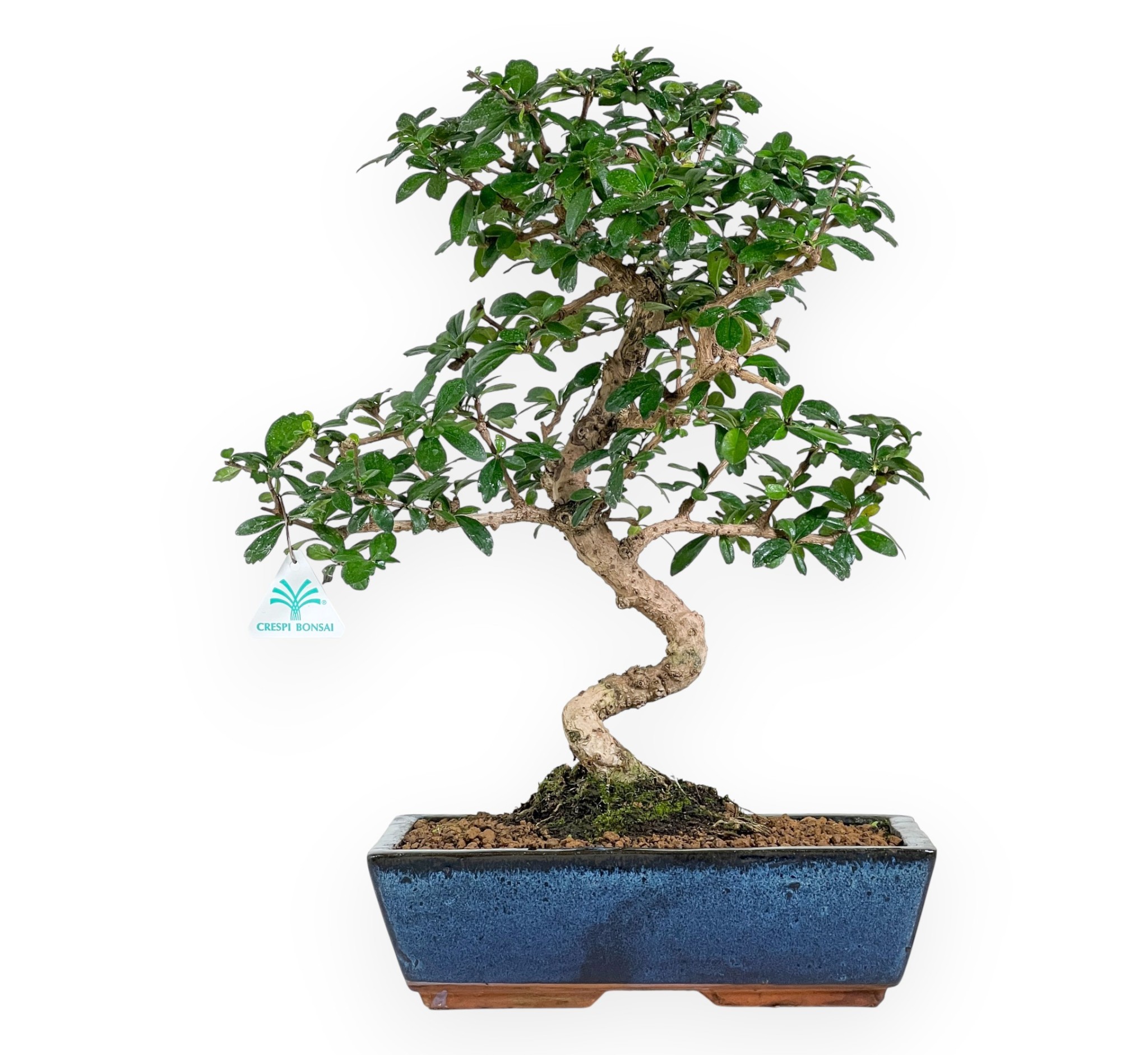 Dieser Bonsai aus Carmona macrophylla (tee pflanze) gehört zu den immergrünen Zimmerpflanzen und wird wegen seiner kleinen, sternförmigen weißen Blüten geschätzt, die er im Frühjahr und Sommer hervorbringt. Sein Laub mit glänzenden, kompakten Blättern ist gut strukturiert und verleiht ihm ein elegantes Aussehen. Er hat eine harmonische Form mit einem S-förmigen Stamm, der sich geschwungen und schlank entwickelt. Er wird in einem rechteckigen, blau glasierten Steingut Topf kultiviert, der die Ästhetik des Bonsais unterstreicht und einen zarten Kontrast zum intensiven Grün der Blätter bildet.