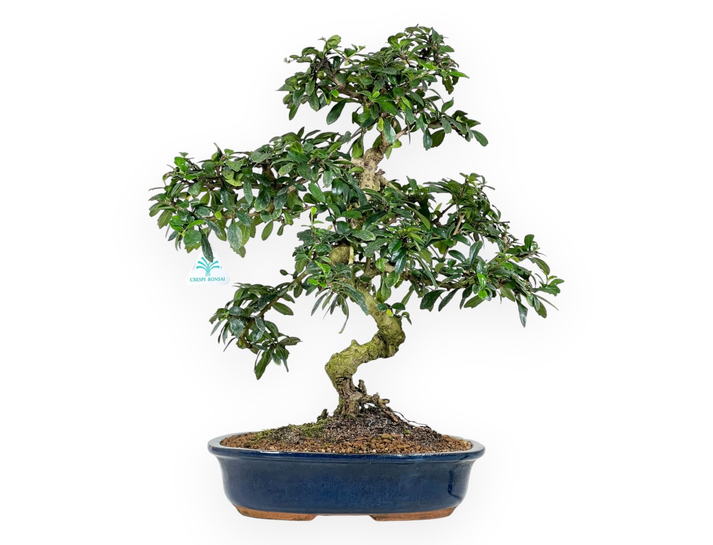 Dieser Bonsai aus Carmona macrophylla (tee pflanze) gehört zu den immergrünen Zimmerpflanzen und wird wegen seiner kleinen, sternförmigen weißen Blüten geschätzt, die er im Frühjahr und Sommer hervorbringt. Sein Laub mit glänzenden, kompakten Blättern ist gut strukturiert und verleiht ihm ein elegantes Aussehen. Er hat eine harmonische Form mit einem S-förmigen Stamm, der sich geschwungen und schlank entwickelt. Er wird in einem oval dunkelblau glasierten Steingut Topf kultiviert, der die Ästhetik des Bonsais unterstreicht und einen zarten Kontrast zum intensiven Grün der Blätter bildet.