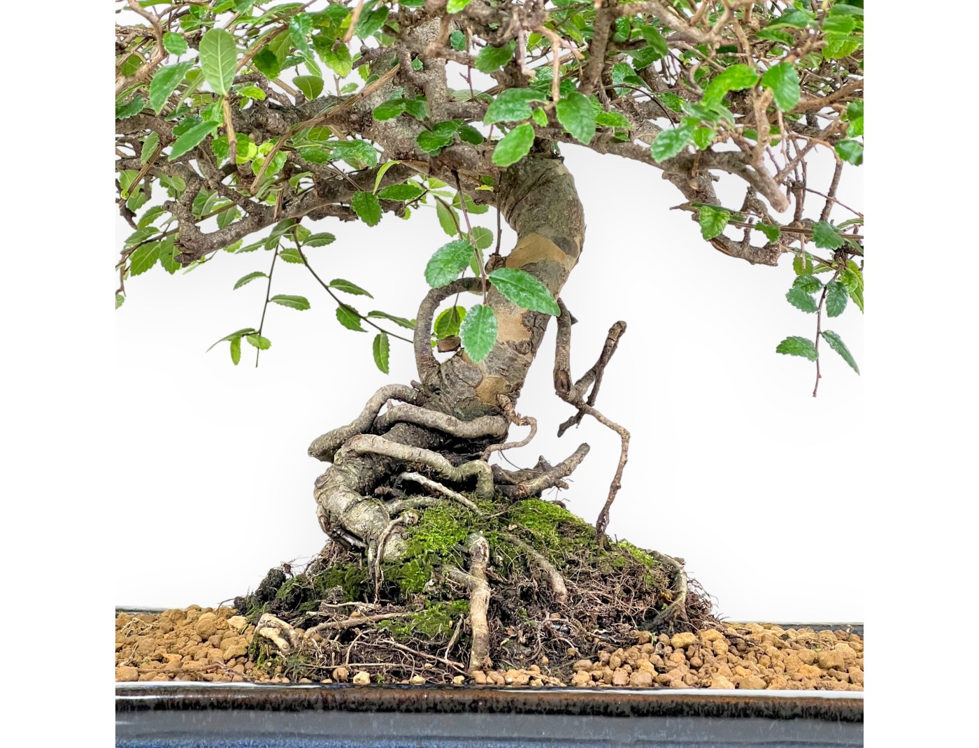 Der Zelkova nire (Ulmen) Bonsai gehört zu den immergrünen Zimmerpflanzen, und wird für seine Widerstandsfähigkeit und sein schnelles Wachstum geschätzt. Sie zeichnet sich durch dichtes Laub mit kleinen, tiefgrünen, gezackten Blättern aus. Er hat einen etagen Stil, eine robuste und gut entwickelte Struktur, die durch freiliegenden Wurzeln bereichert wird, die diesen Bonsai charakteristisch und sehr reizvoll machen, einen skulpturalen Effekt erzeugen und die Schönheit der Wurzeln hervorheben. Er wird in einem rechteckige blau glasierten Steingut Topf, bringt er die Farbe der Blätter und passt perfekt zum raffinierten Aussehen des Bonsai.