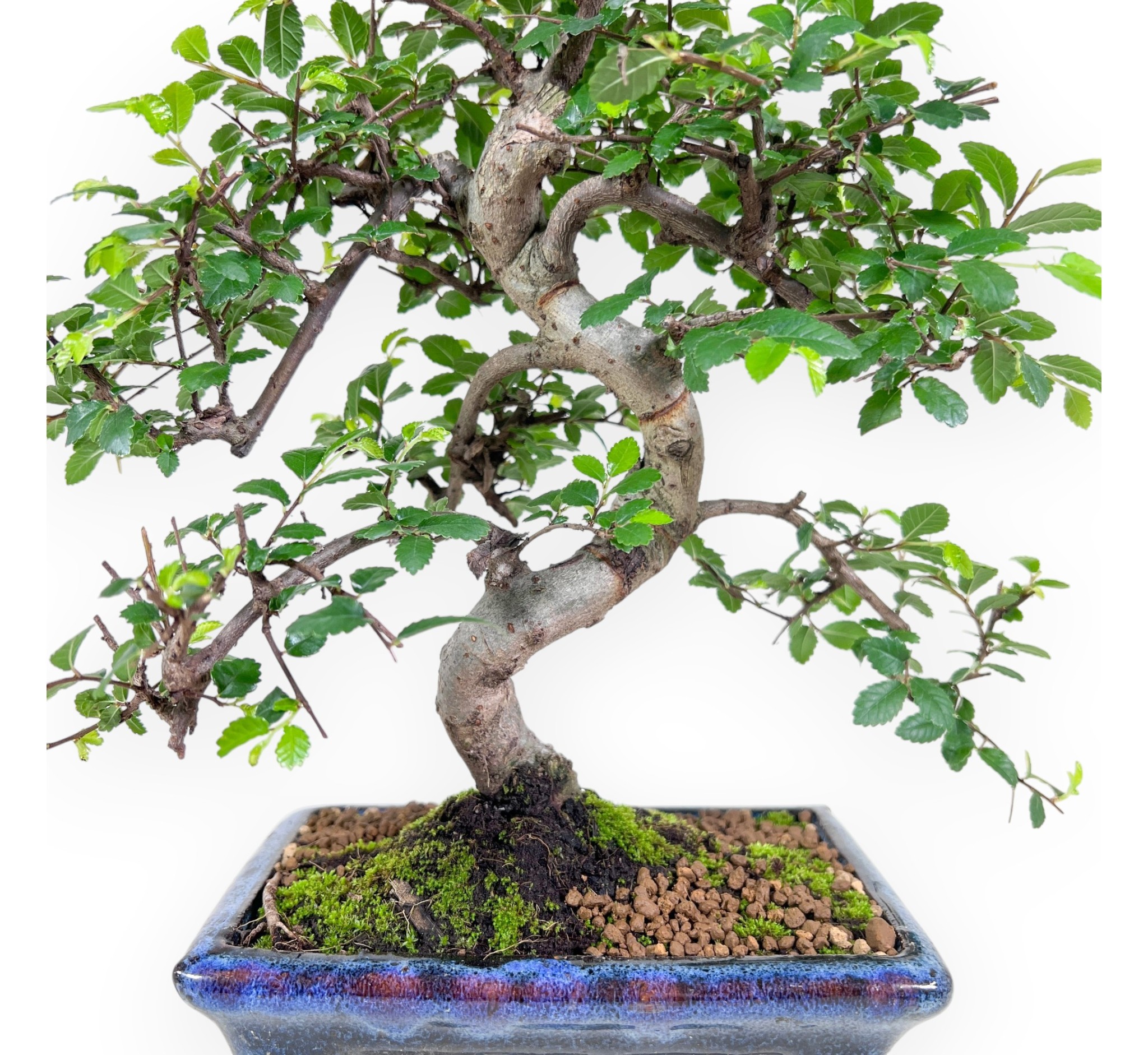 Der Zelkova nire Bonsai wird für seine Widerstandsfähigkeit, Anpassungsfähigkeit und vegetative Kraft geschätzt. Sie zeichnet sich durch ihre kleinen, tiefgrünen, gezackten Blätter aus, die ein kompaktes und harmonisches Blattwerk bilden, das jedes Detail der Struktur zur Geltung bringt. Dieses Exemplar hat einen gewundenen und wohlproportionierten Stamm, der eine geordnete, in Pfählen entwickelte Verzweigung unterstützt. Die solide und ausgereifte Struktur ist Ausdruck von Ausgewogenheit und ästhetischer Tiefe. Er ist in einem rechteckigen, blau glasierten Steinguttopf gepflanzt, der einen eleganten Farbkontrast zu dem leuchtend grünen Laub bildet.