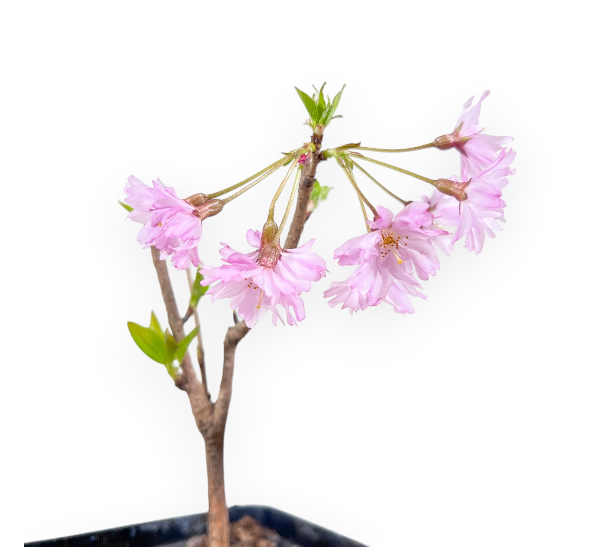 Arbeitspflanze von Prunus subhirtella fukubana, gekennzeichnet durch eine Höhe ohne Topf von 12,5 cm und einen Stammumfang von 1 cm. Die Pflanze wird in einem runden Plastiktopf mit den Maßen 9,5 x 9,5 x 9,5 cm gezogen.