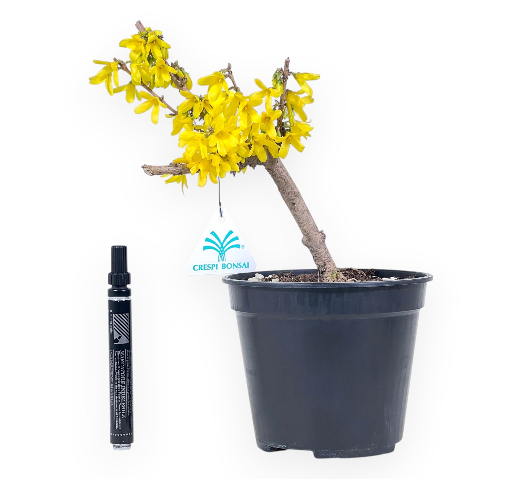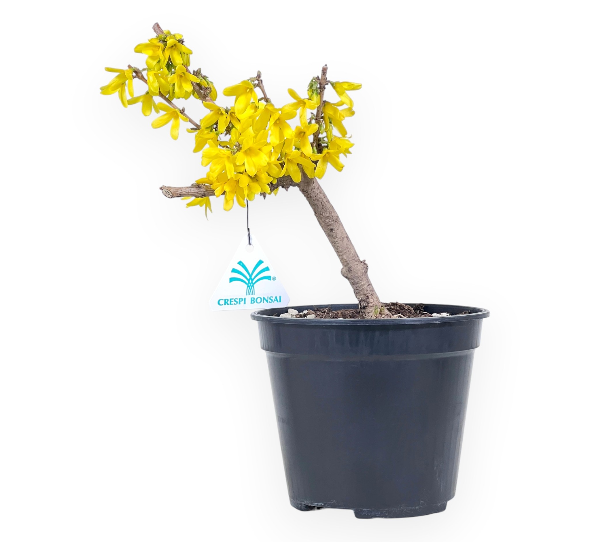 Pre-Bonsai von Forsythia intermedia 'Mikador', einer sommergrünen Art, die für ihre frühen, leuchtend gelben Frühlingsblüten bekannt ist. Die zahlreichen kleinen Blüten, die entlang der noch kahlen Zweige blühen, sorgen für einen lebendigen und malerischen Effekt, der diese Art für blühende Bonsai besonders interessant macht. Es handelt sich um ein Arbeitsmaterial, das in einem Plastiktopf kultiviert wird; ideal für diejenigen, die die Pflanze aufstellen und entwickeln und ihre Entwicklung und Formung im Laufe der Zeit verfolgen möchten.