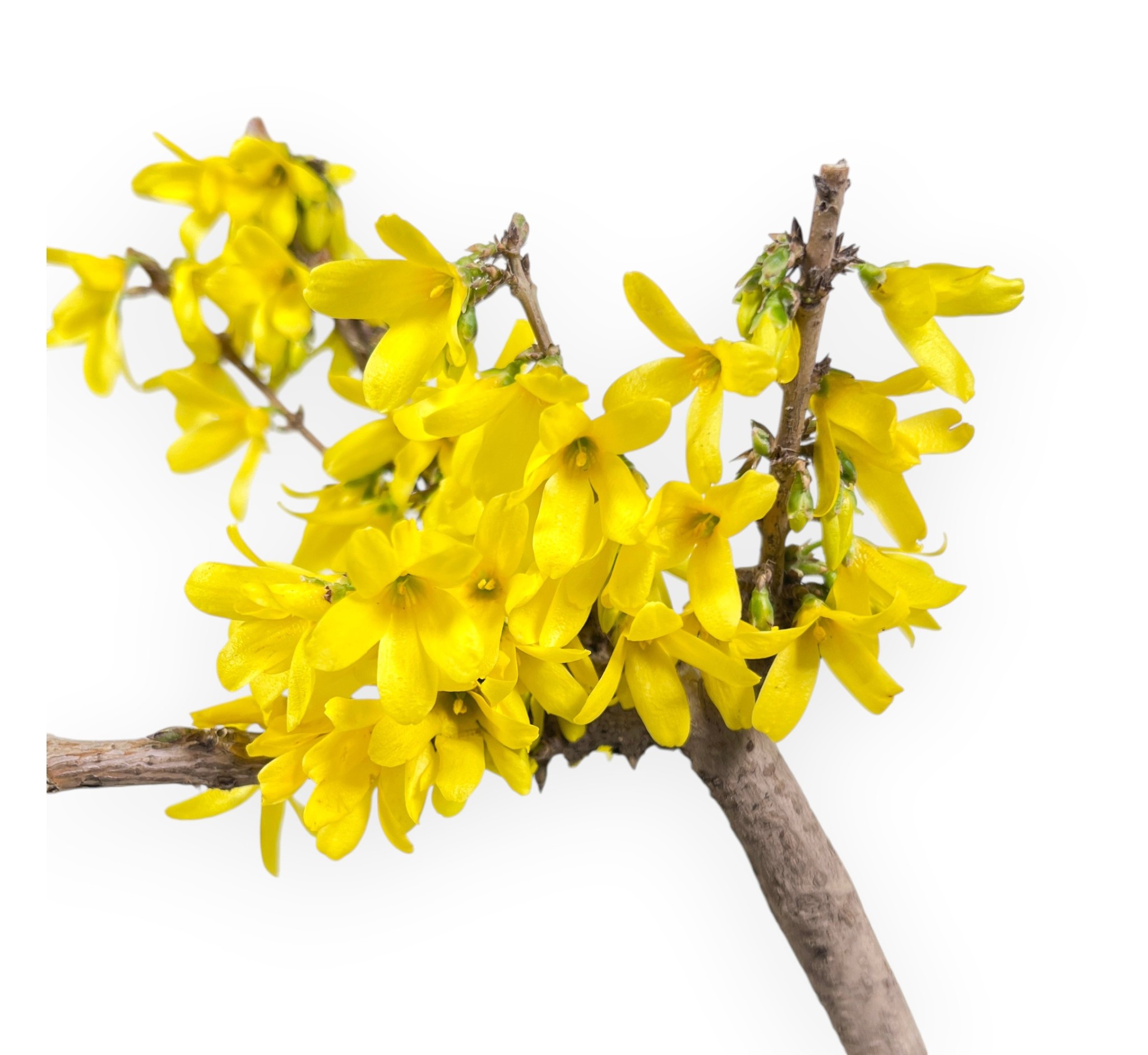 Die Arbeitspflanze von Forsythia intermedia mikador zeichnet sich durch eine Höhe ohne Topf von 17,5 cm und einen Stammumfang von 1 cm aus. Die Pflanze wird in einem runden Kunststofftopf mit den Maßen Ø14x11,5 cm gezogen.