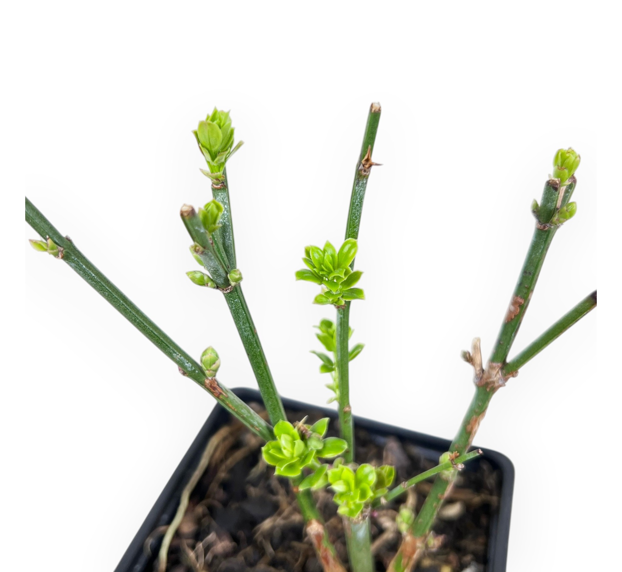 Die Arbeitspflanze von Jasminum nudiflorum zeichnet sich durch eine Höhe ohne Topf von 11,5 cm und einen Stammumfang von 0,5-0,7 cm aus. Die Pflanze wird in einem quadratischen Plastiktopf mit den Maßen 9x9xH9,5 cm gezogen.