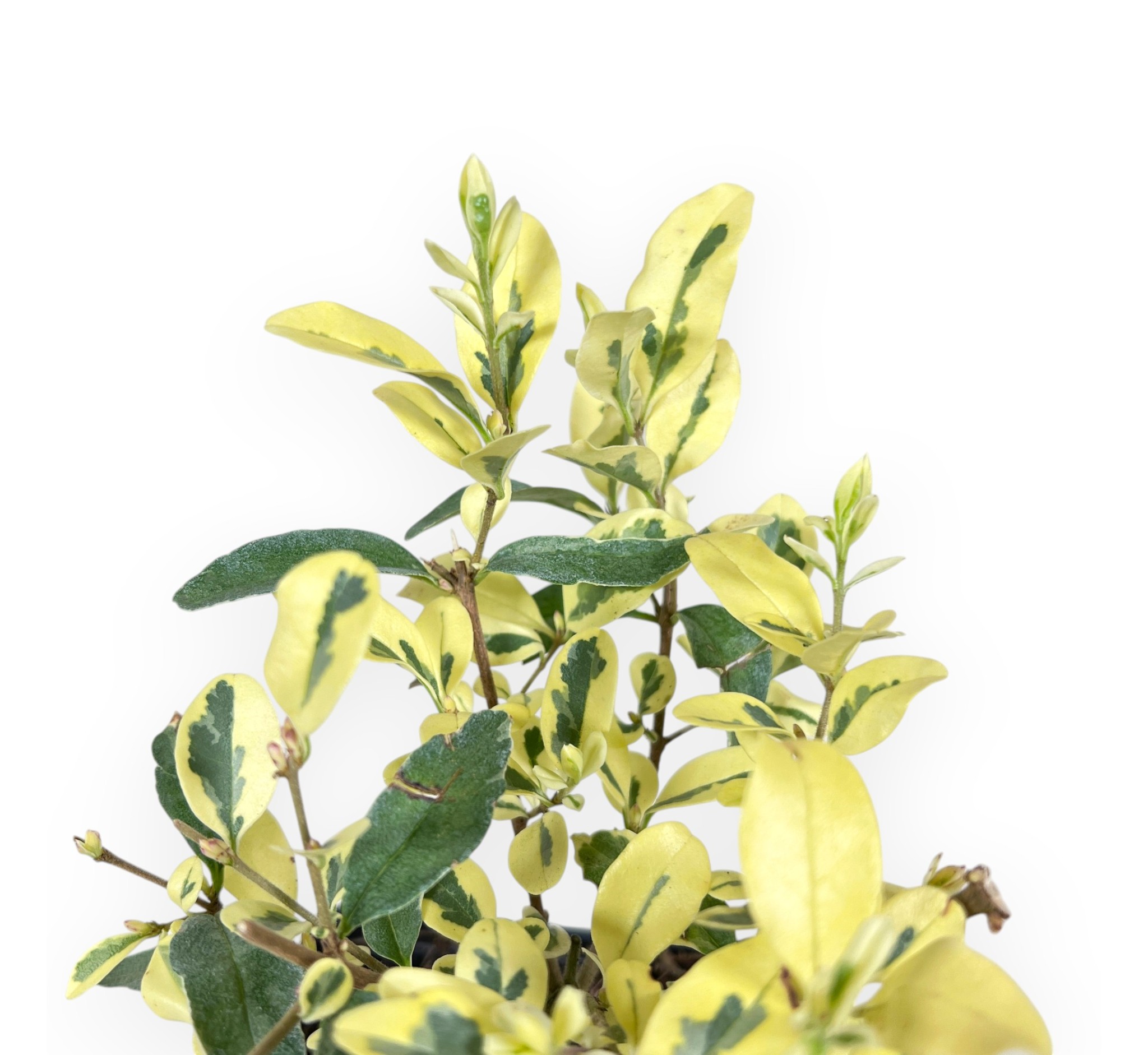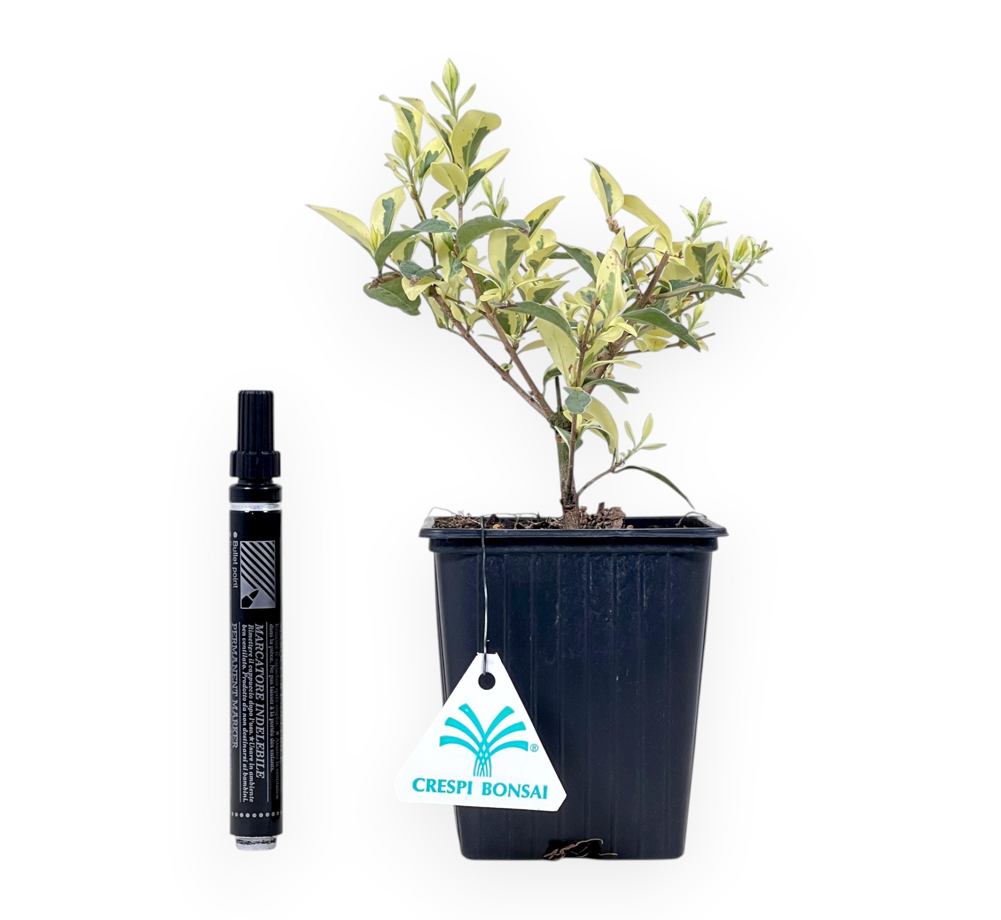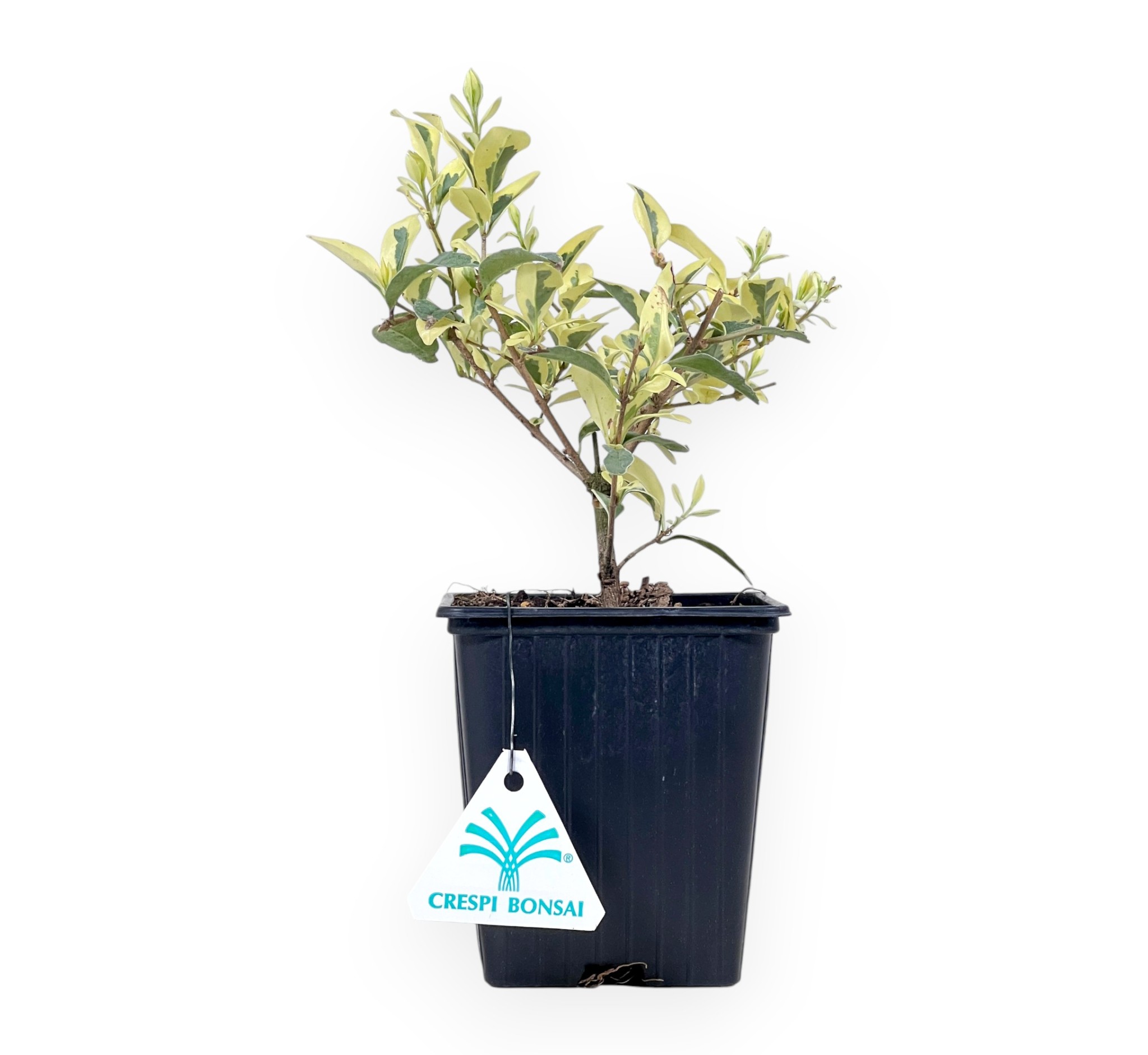 Arbeitspflanze von Ligustrum ibota musli (Liguster), halbimmergrün, geschätzt für sein buntes, helles Laub. In milden Klimazonen behält er den größten Teil seines Laubes über den Winter, während er in kälteren Gegenden teilweise seine Blätter verliert. Die kleinen, ovalen und leicht zugespitzten Blätter zeichnen sich durch ein dekoratives Grün und eine cremegelbe Panaschierung aus. Im Frühjahr erscheinen die neuen Triebe heller und leuchtender, während sich im Sommer der Farbkontrast verstärkt und das Laub besonders lebendig wirkt. Im Herbst kann das Laub etwas wärmere Farbtöne annehmen, bevor es schließlich teilweise abfällt. Im Frühjahr und Sommer kann die Pflanze kleine, duftende weiße Blüten hervorbringen, die manchmal von dunklen Beeren gefolgt werden, wenn sie reif sind, was der Pflanze ein weiteres dekoratives Element verleiht. Sie wird in einem quadratischen schwarzen Plastiktopf gezogen.