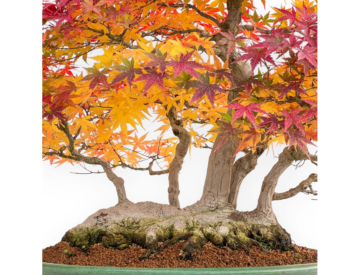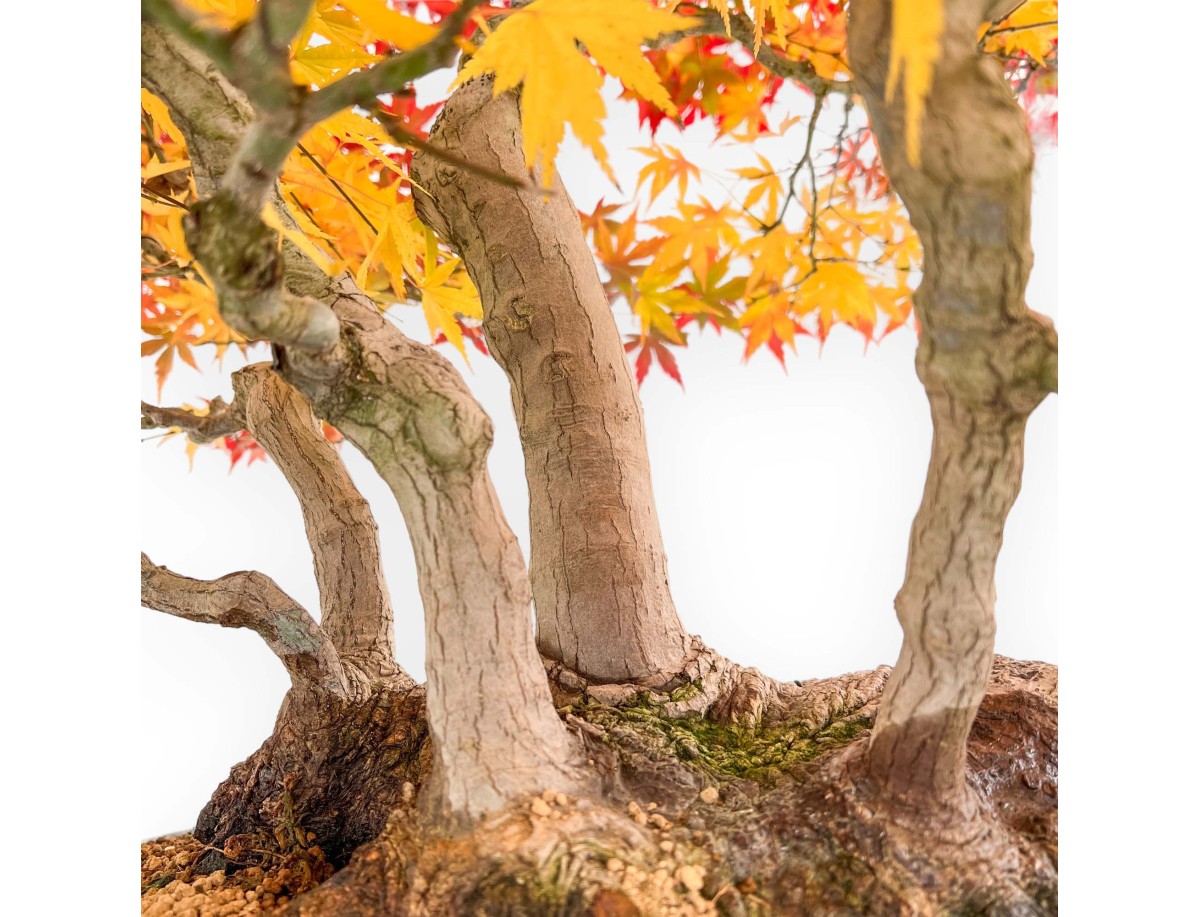 This bonsai specimen of Acer palmatum viridis (maple) is a deciduous species, known for its palmate leaves whose colours change with the seasons. The bright green foliage turns orange-yellow to deep red in autumn and sheds its leaves in winter. It is cultivated in raft style (Ikadabuki), which is particularly striking because it is reminiscent of those trees that in nature, after breaking and lying on the ground, begin to grow their branches upwards from a common horizontal base. The branches gradually become trunks and the effect is that of a real forest starting from the same large nebari. The oval green glazed stoneware vase contrasts elegantly with the red-orange hues of the autumn foliage, enhancing its beauty and combining with the green leaves for a harmonious tone-on-tone in the spring-summer months.