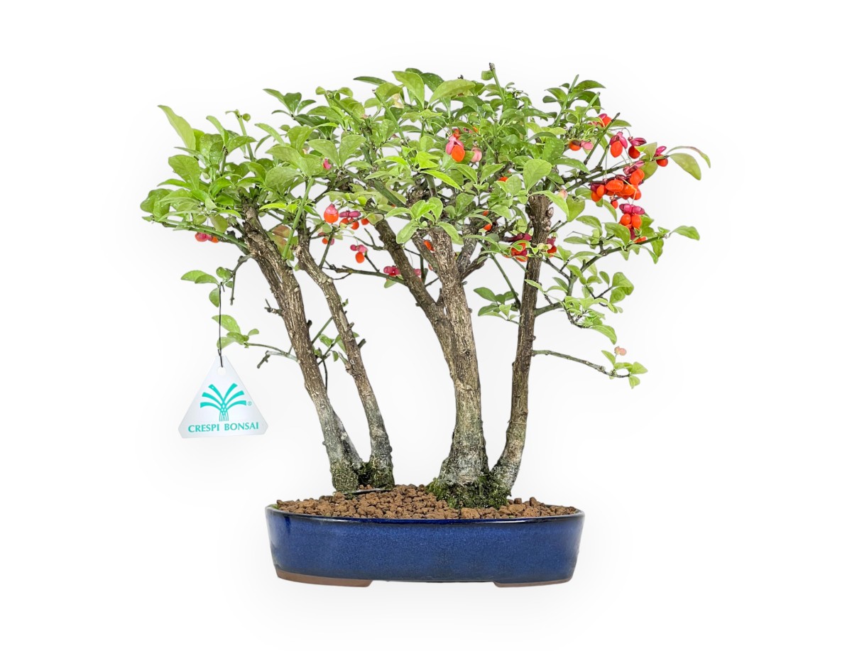 This Euonymus (evonymus) bonsai is an ornamental deciduous fruiting species. It is prized for its spring flowering, small 4-petalled white-green flowers, and subsequent fruiting with reddish capsule fruits that open as they ripen, revealing red-orange seeds. In autumn, the foliage takes on beautiful red-orange hues and sheds in winter, often leaving the fruits visible on the branches. The oval blue glazed stoneware pot enhances the harmonious structure of the tree. Cultivated in the forest style (Yose-ue), it gives movement and naturalness.