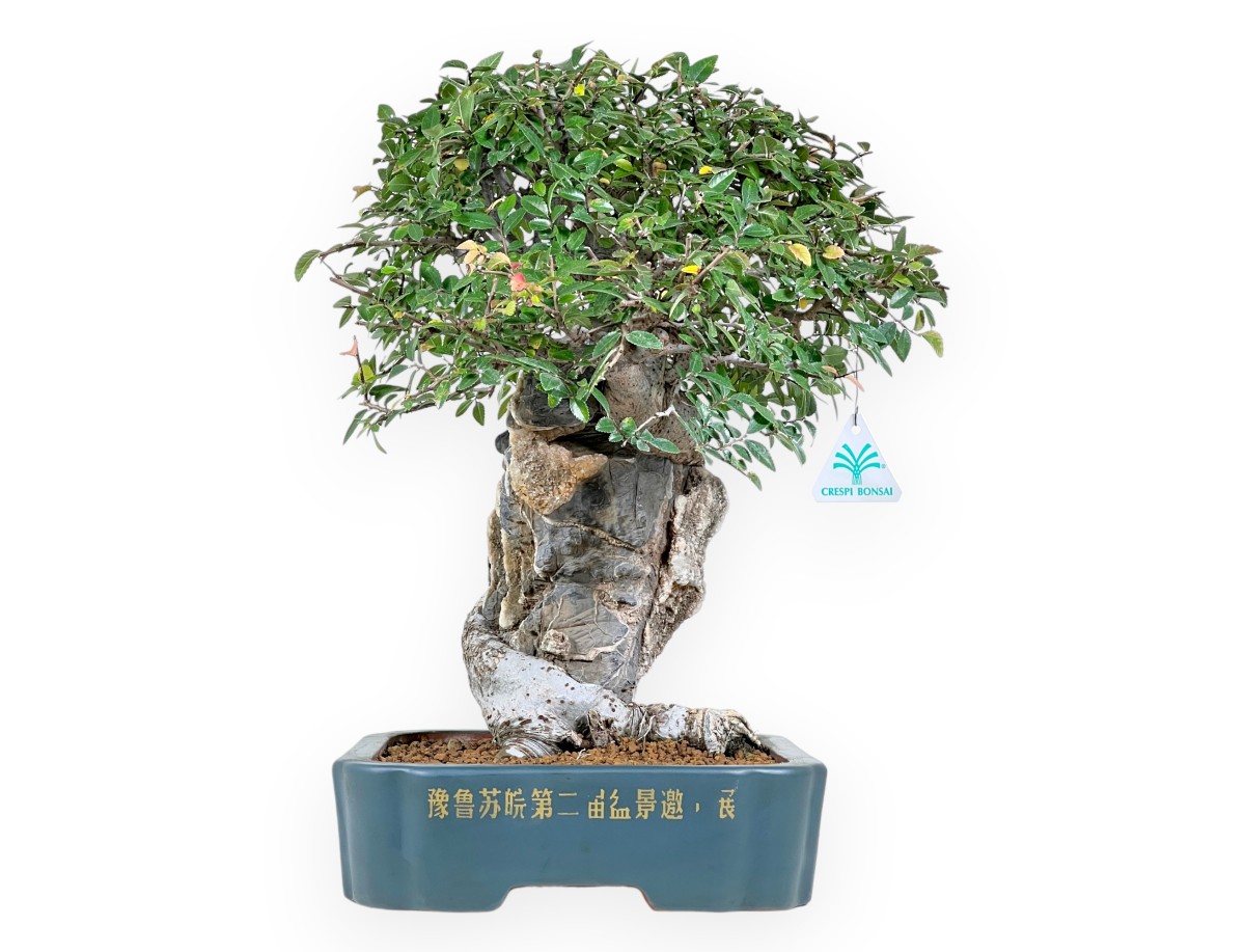This bonsai of Ulmus Parviflora (elm) is a deciduous species highly valued in bonsaism for its hardiness, harmonious growth and dense branching. The compact and well-balanced foliage composed of small toothed leaves gives the bonsai tree a mature and rich character. The foliage turns orange-yellow in autumn and sheds its leaves in winter. This specimen is styled on a rock (Seki-joju), where the roots cling to and intertwine with a large central stone, creating a natural and highly symbolic effect. The strong trunk wraps around the rock with an elegant and dynamic movement. The bonsai is grown in a rectangular petrol-green glazed stoneware pot, embellished with refined golden decorations: depicting a natural landscape and oriental writing that enhance the aesthetics of the bonsai.