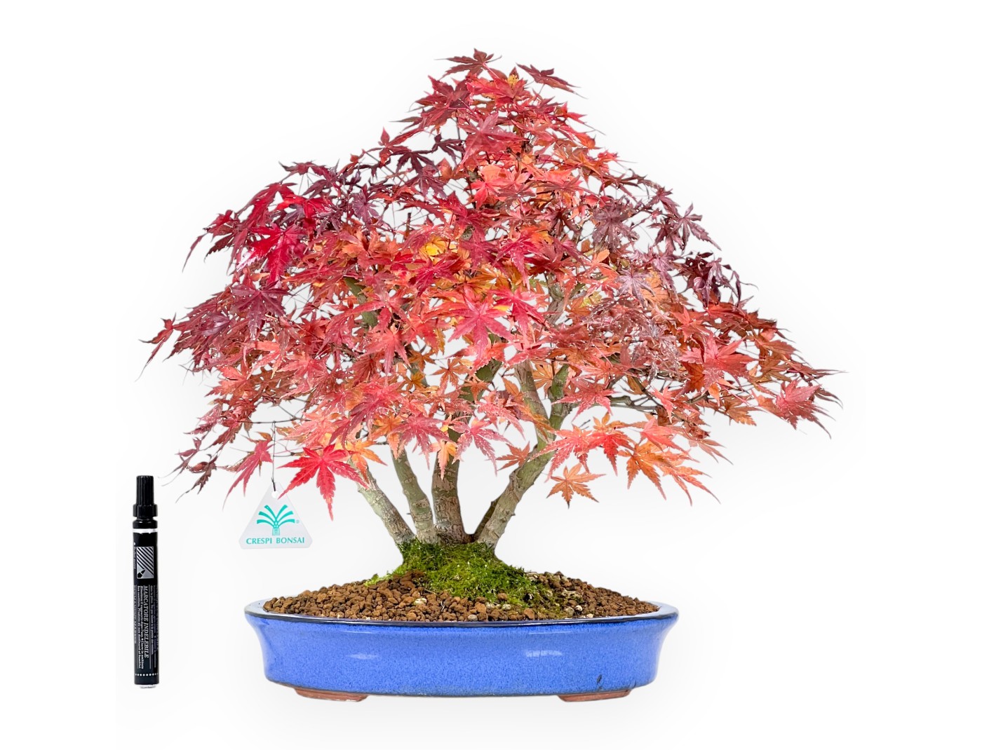 This bonsai of Acer palmatum deshojo (maple) is a deciduous species, known for its palmate leaves with vibrant seasonal tones. The bright green foliage turns orange-yellow to deep red in autumn and sheds its leaves in winter. Cultivated in stump style (Kabudachi), it has multiple trunks growing from a single nebari, creating a natural and harmonious effect. The oval blue glazed stoneware pot contrasts elegantly with the shades of the foliage enhancing its beauty.