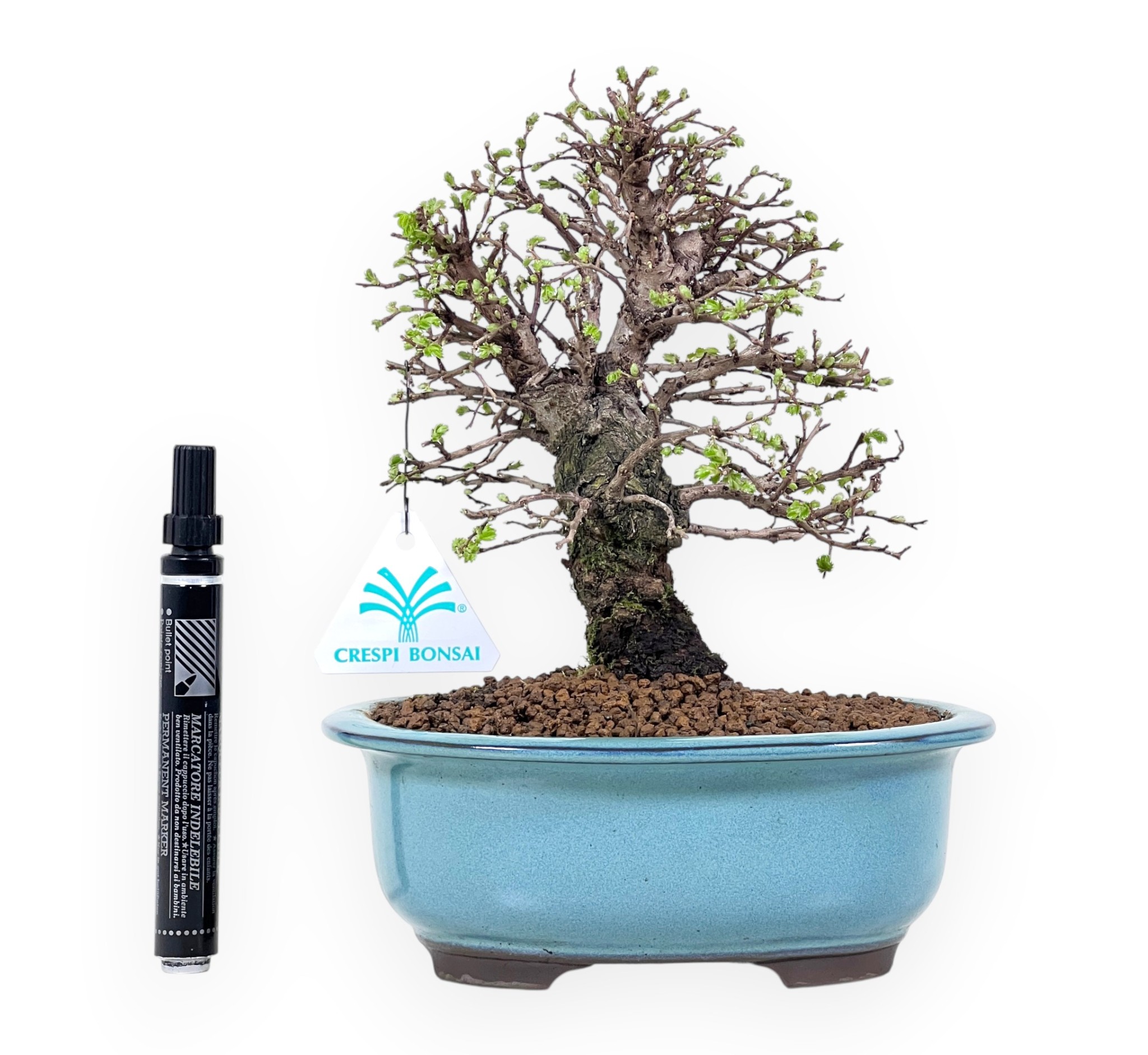 Elm bonsai characterised by a height without pot of 17,5 cm, and a trunk size of 3. The plant is grown in an oval glazed stoneware pot whose dimensions are 17,5x14,5xH6,5 cm.
