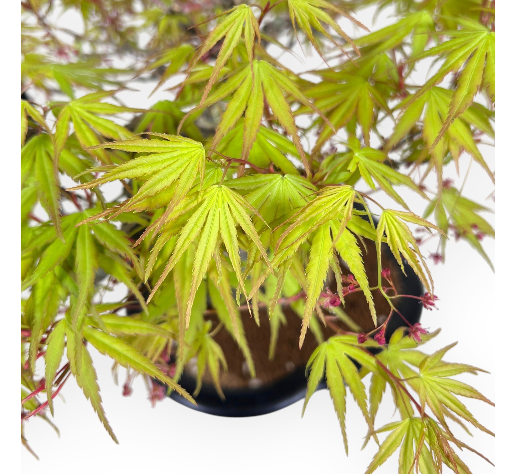 This bonsai of Acer palmatum Arakawa is a deciduous species highly valued for its delicate and finely engraved foliage, which in spring presents itself with vivid green-yellow hues, evolving during the season towards more intense and warm colours in autumn, and then shedding its leaves in winter. The tree has a characteristic wrinkled, cortical trunk. The strongly fissured bark conveys a sense of maturity and rusticity. This bonsai is characterised by a sinuous, harmonious trunk that develops with elegant movements, giving the plant dynamism and naturalness. The branching is well-distributed and creates a compact but light foliage with neatly arranged antlers that enhance the fineness of the leaves. It is grown in a dark blue glazed ceramic cloud pot, which creates a refined colour contrast with the foliage tones and contributes to the overall elegance of the bonsai.
