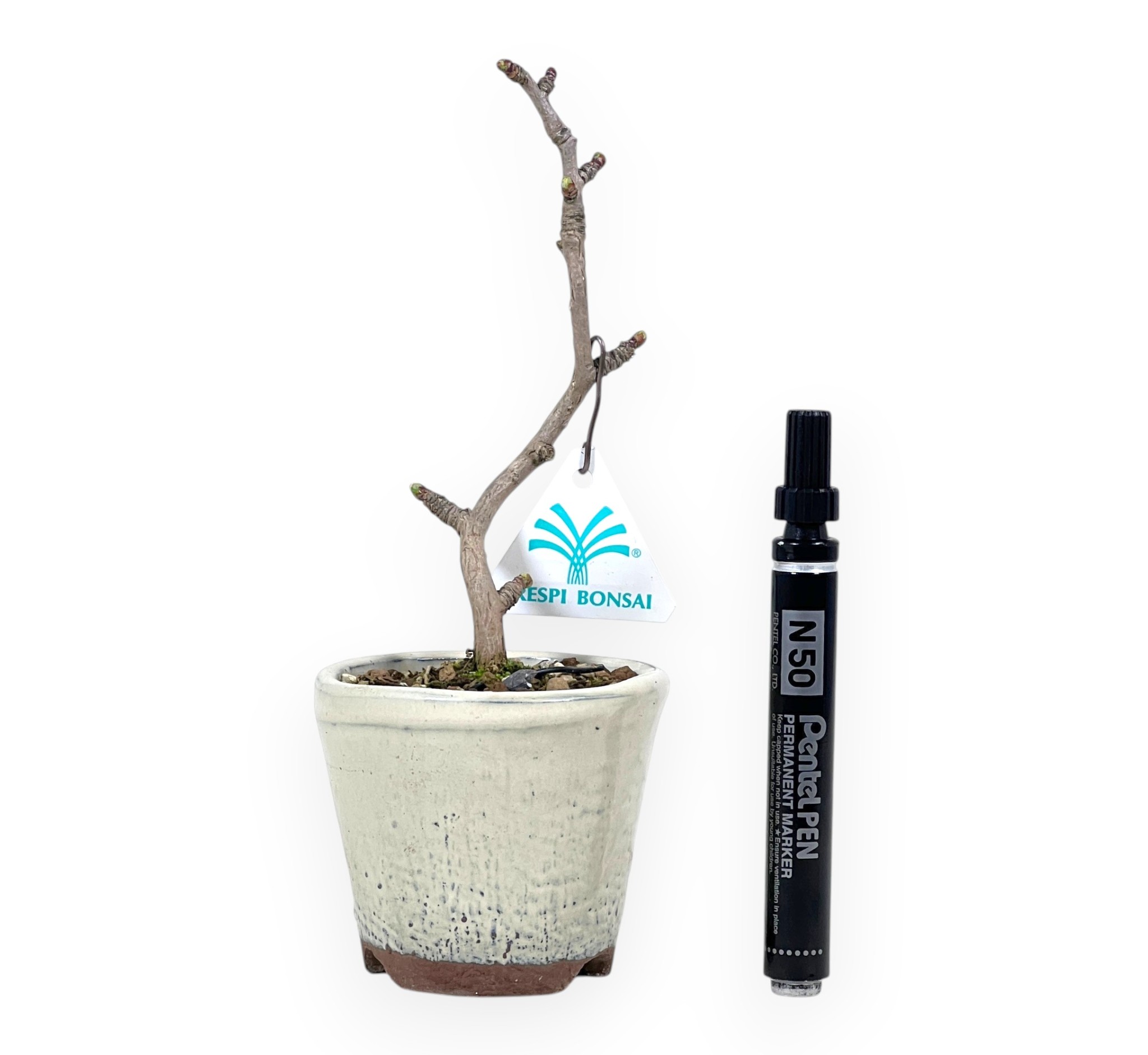 Shohin bonsai of Ginkgo biloba, an ancient deciduous species, known for its fan-shaped leaves and intense yellow autumn colouring. The foliage, which is green at first, turns orange-yellow in autumn and sheds its leaves in winter. It has a sinuous trunk with a fascinatingly fissured bark. Grown in a round cream glazed stoneware pot complete the bonsai by enhancing the beauty of the plant, providing balance and refinement.