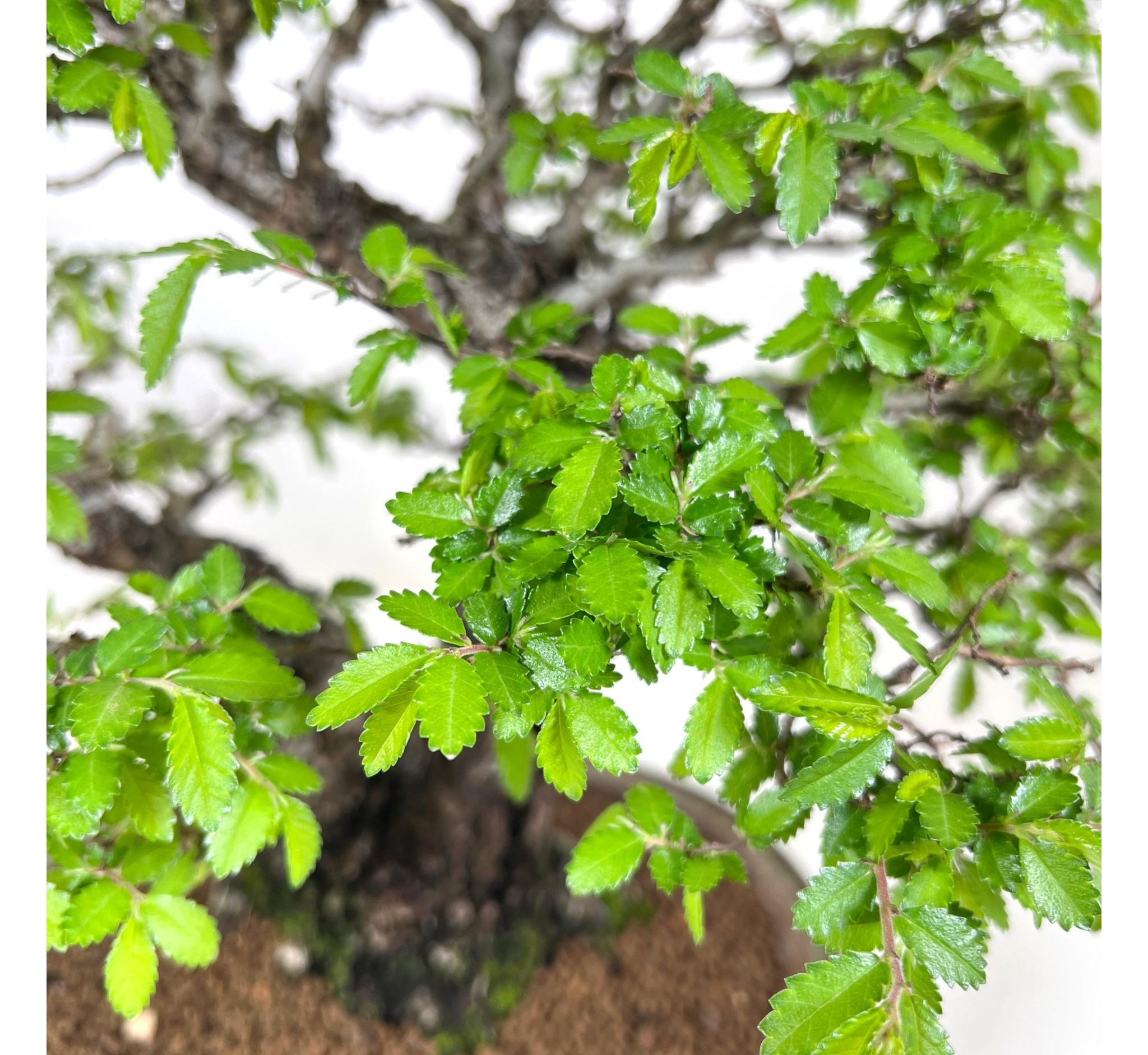 Bonsai of Ulmus Parviflora (elm), a deciduous species, highly valued in bonsaism for its hardiness, harmonious growth and dense branching. The compact and well-balanced foliage, composed of small toothed leaves, gives the bonsai tree a mature and rich character. The foliage turns orange-yellow in autumn and sheds its leaves in winter. This specimen has a very robust, old-looking trunk with a sinuous and elegant development. Cultivated in an oval blue and bronze glazed stoneware pot, and is perfect for enhancing the bright colors of the leaves and the dark color of the trunk.