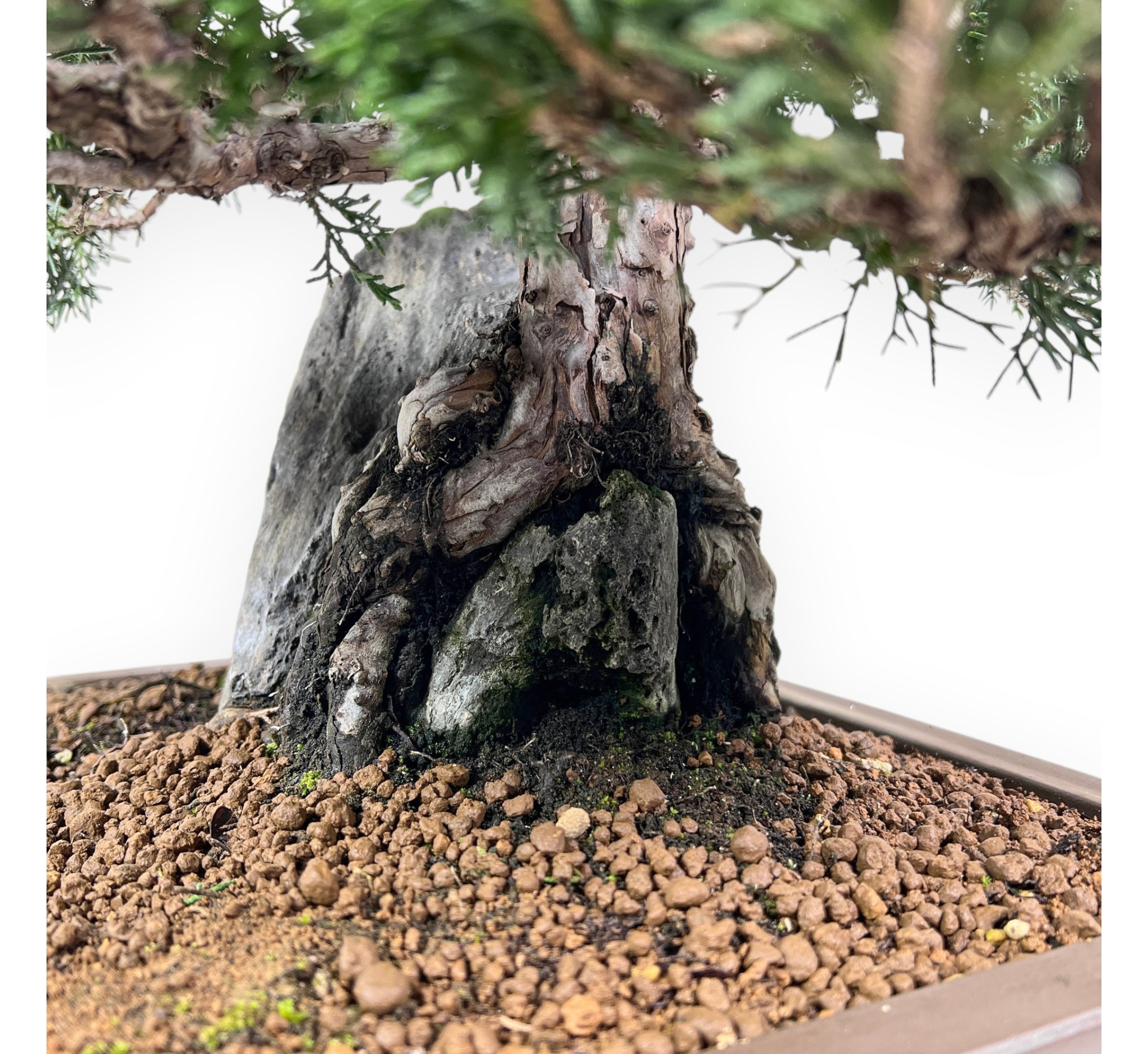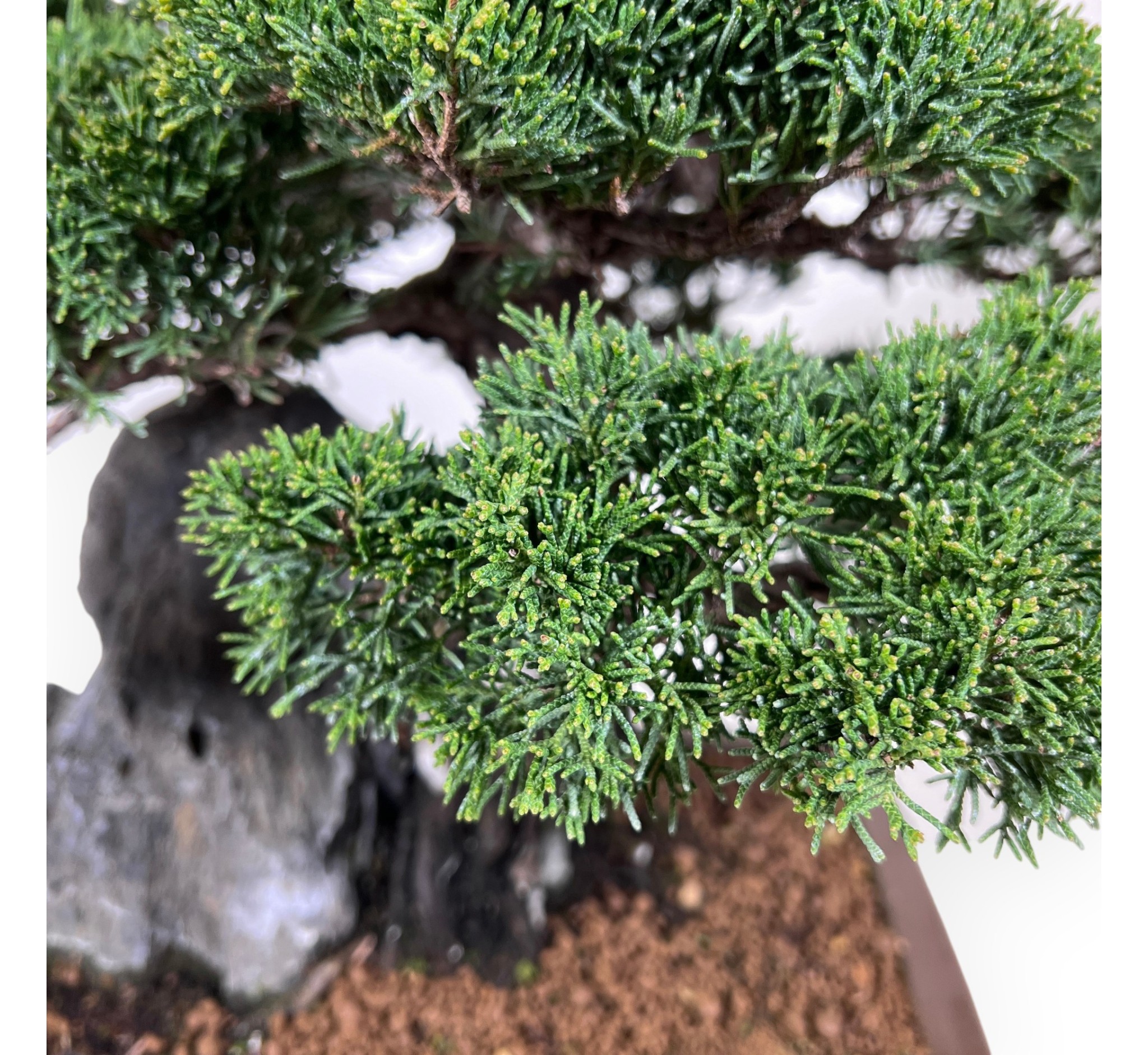 The bonsai of Juniperus chinensis (Chinese Juniper), an attractive evergreen conifer, is prized for its elegance and remarkable durability. The needle-like, deep green, dense and compact foliage creates well-defined masses that enhance the structure and give depth to the composition. Over time the bark tends to crack, taking on a mature appearance, which adds to the character of the specimen. This bonsai is grown in the rock style (Seki-joju), where the trunk develops adhering to the stone and the roots wrap around the rock in a scenographic way, evoking the strength of nature and the plant's ability to adapt to impervious environments. The whole conveys balance, solidity and harmony, with a dynamic line that accompanies the eye from the base to the top of the foliage. It is grown in a rectangular unglazed stoneware pot with natural, textural tones that recall the elements of earth and rock, enhancing the authenticity of the composition and giving the bonsai a majestic and refined appearance.